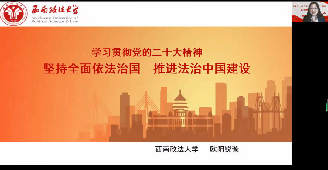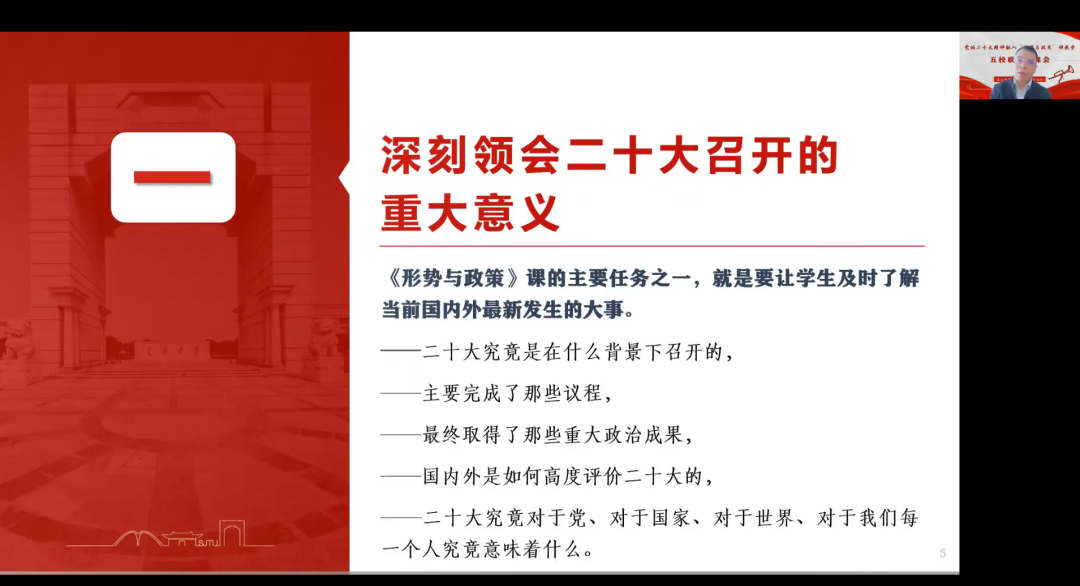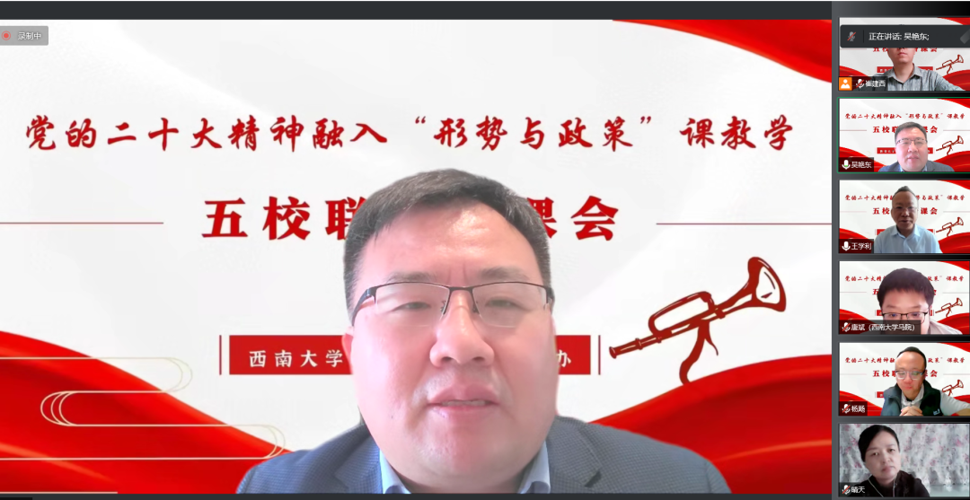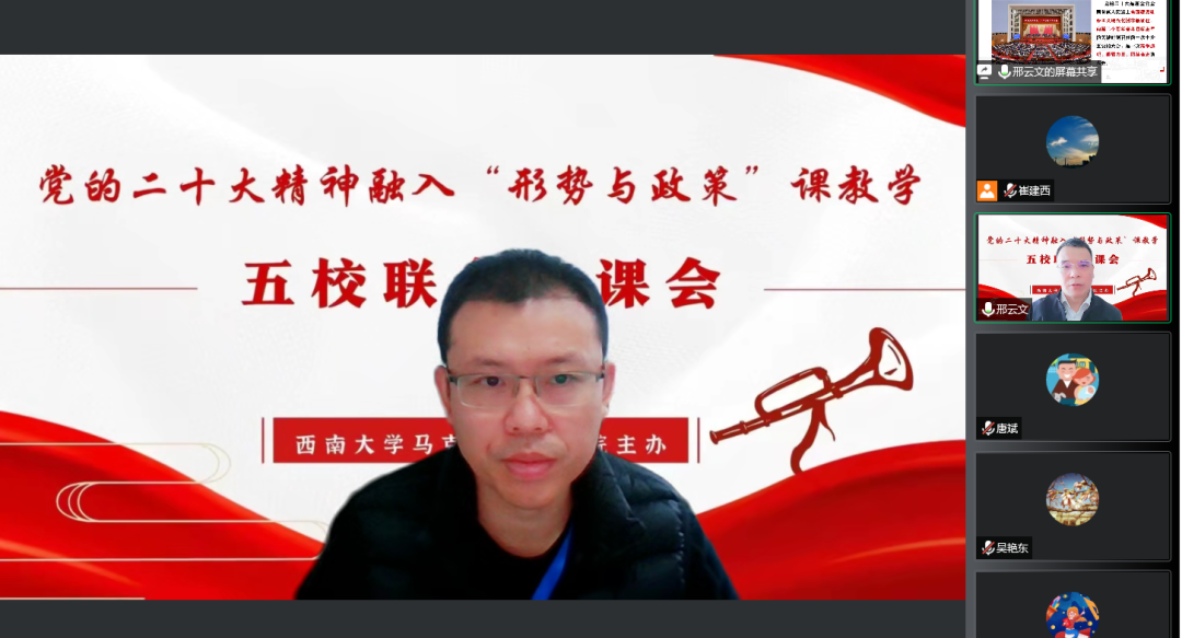 为深入学习党的二十大精神,将党的二十大精神及时、准确融入“形势与政策”课教学,11月7日上午,由yl88858永利中国主办,全国高校思想政治理论课“手拉手”集体备课中心(yl8858永利集团-重庆市)、重庆市大中小学思政课一体化建设协同创新中心承办,西南政法大学yl88858永利中国、重庆医科大学yl88858永利中国、重庆城市管理职业学院yl88858永利中国、新疆农业职业技术学院yl88858永利中国协办的党的二十大精神融入“形势与政策”课教学联合备课会顺利进行。来自重庆、新疆等地的近150位思政课教师相聚云端,共襄盛会。此次联合备课会共分为专家导学、教学观摩、集体备课三个阶段,会议分别由yl88858永利中国党委常务副书记廖晓衡、副院长吴艳东主持。