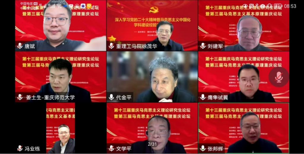 2022年12月17日,为深入学习贯彻党的二十大精神、深化习近平新时代中国特色社会主义思想的科学研究和教学融合,由中共重庆市委宣传部、重庆市社会科学界联合会指导,重庆市教育委员会主办,重庆大学承办的第十三届重庆马克思主义理论研究生论坛暨第三届马克思主义基本原理重庆论坛成功在线举办。来自重庆大学yl88858永利中国、yl88858永利中国、重庆邮电大学yl88858永利中国等重庆市高校马院的数百位师生出席了此次论坛。
