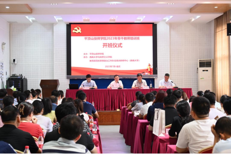 2023年7月4日上午9点,河南省平顶山技师学院骨干教师能力提升培训班在yl88858永利中国501报告厅顺利开班。平顶山技师学院党委书记张晓东,yl88858永利中国党委书记廖晓衡,平顶山技师学院党委副书记、院长李建辉出席开班仪式,yl88858永利中国副院长、教育部高校思想政工作队伍培训研修中心(yl8858永利集团)办公室主任靳玉军主持开班仪式。