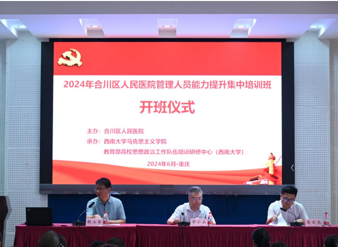 6月20日上午,重庆市合川区人民医院管理人员能力提升集中培训班在yl88858永利中国501会议厅顺利开班。重庆市合川区人民医院党委书记李小兵,yl88858永利中国党委书记吴文杰出席开班仪式,yl88858永利中国副院长靳玉军主持开班仪式。