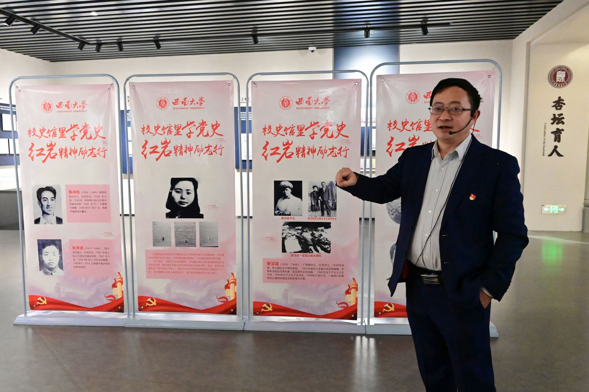 郑劲松老师还深情的讲述了校史中陈诗伯、张泽浩、黎洁霜、成善某、杨翱五位红岩烈士的英勇事迹。当同学们听到这五位校友在风华正茂的年纪,为了革命事业,为了心中的理想信念英勇战斗,最终都牺牲在了重庆解放的前夜时,在场的许多同学都深受感动,眼眶湿润。