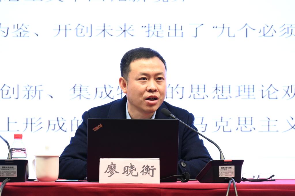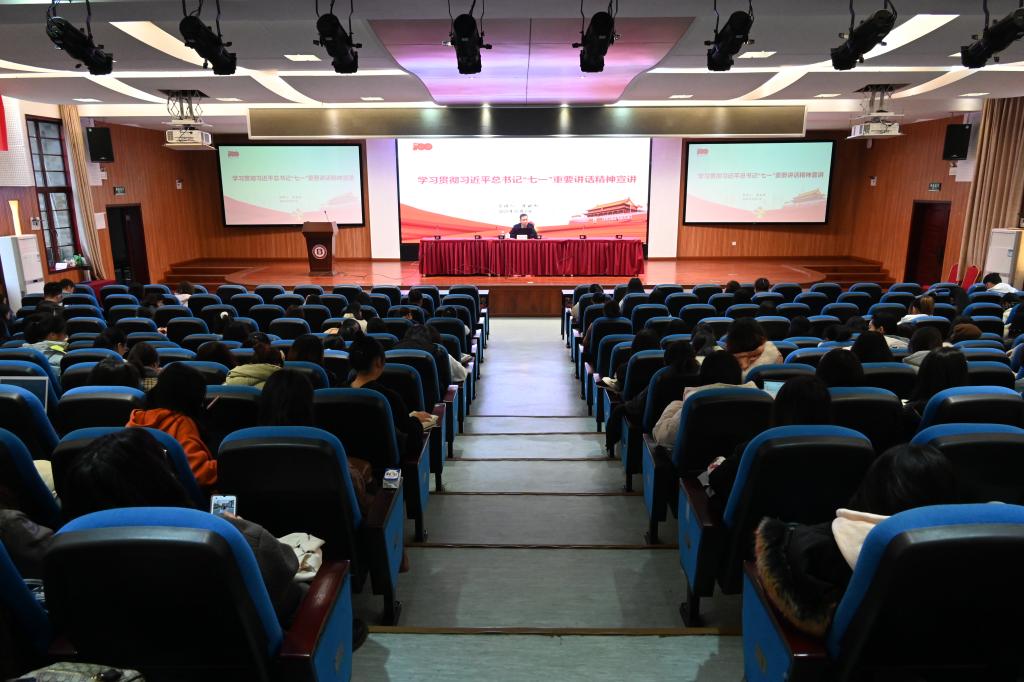 其次,廖晓衡从总论、分论和总语三个部分具体讲解了习近平总书记“七一”讲话提出的一系列新思想、新观点、新要求。围绕一个目标、一个主题、“四个伟大成就”、四个庄严“宣告”、伟大建党精神"、“九个必须”和“一个伟大号召”清楚地讲解了“七一”讲话的主要内容。