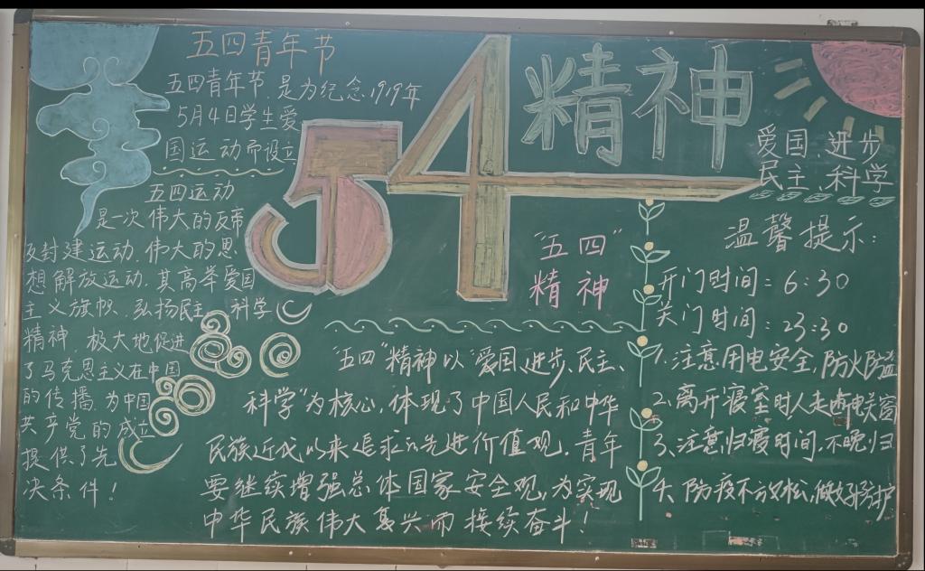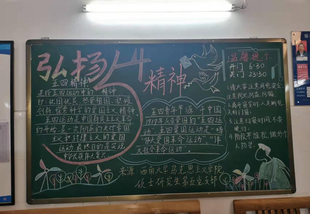 在中国共产主义青年团建团100周年之际,为深刻感悟党领导中国青年运动的光辉历程、深入理解中国共产主义青年团百年来的实践经验,全面落实习近平总书记寄语青年的殷殷嘱托,硕士研究生第五党支部开展了“五四”主题板报活动,旨在用青年喜闻乐见的形式宣传以“爱国、进步、民主、科学”为核心的“五四”精神,以此来引领青年、激励青年。