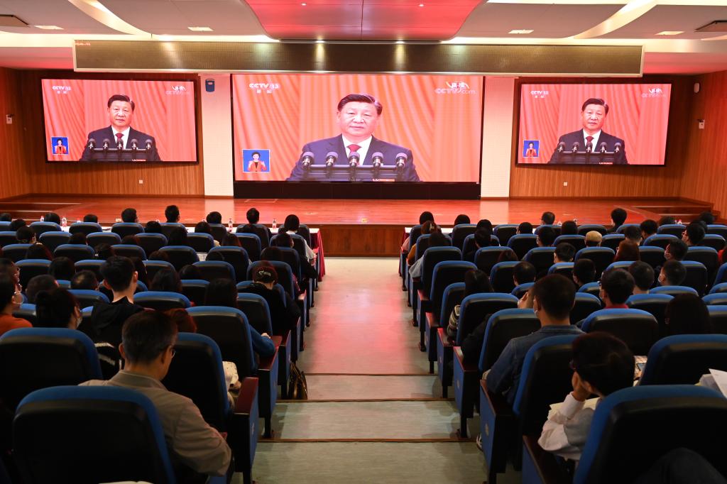 10月16日上午,yl88858永利中国党委组织全体教职工和学生党员400余人,集中收看党的二十大开幕盛况,认真聆听习近平总书记代表第十九届中央委员会向党的二十大作的工作报告。大家精神振奋,热情高涨,座无虚席。