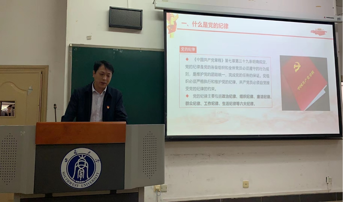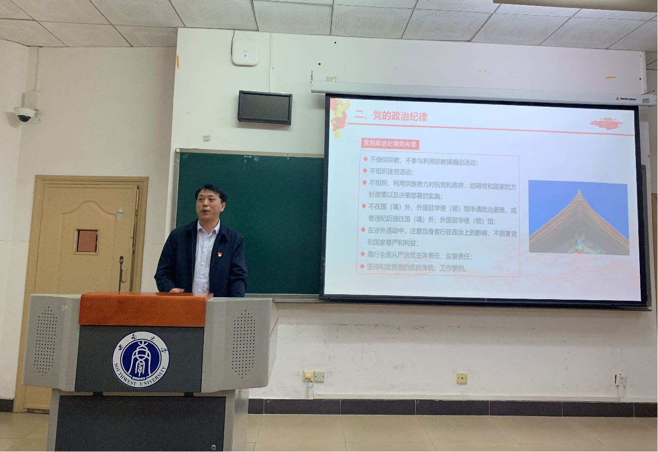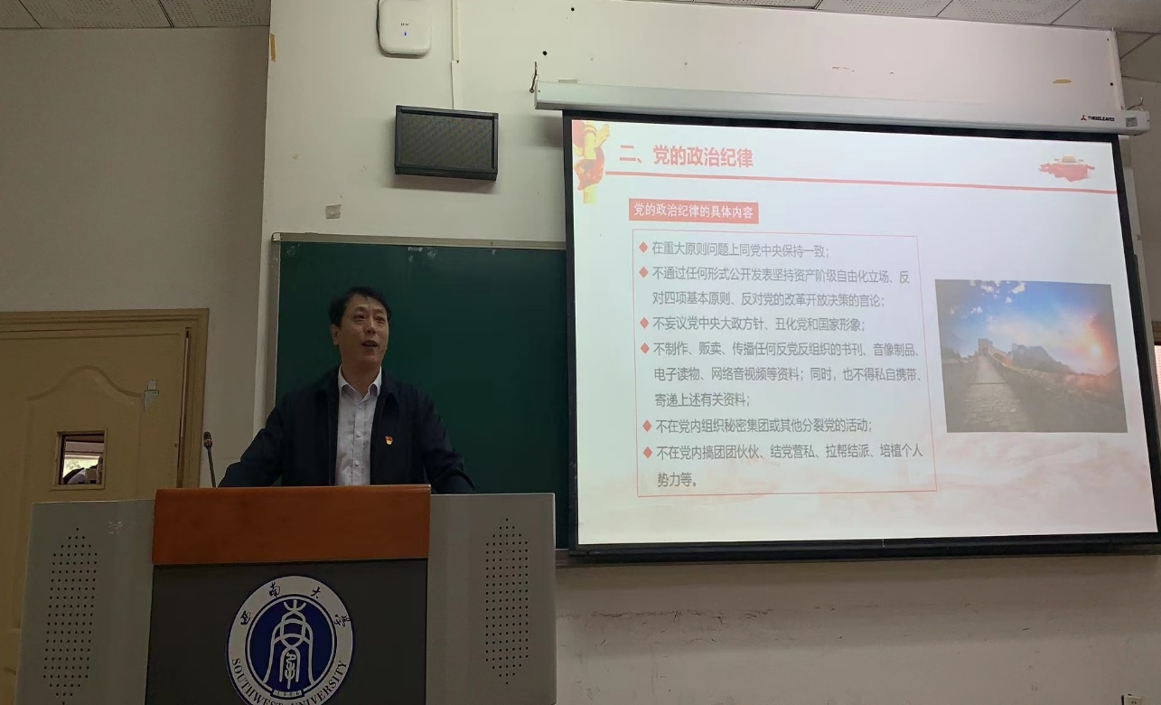 最后,刘东升同志结合学生学习生活实际,讲述了青年党员如何自觉严守党的政治纪律:要自觉加强理论武装,用习近平新时代中国特色社会主义思想凝心铸魂,坚定拥护“两个确立”、坚决做到“两个维护”;要做好带头与表率作用,在学习生活中要自觉做到言行一致,自觉维护党的团结统一;再次是要积极发扬批评与自我批评的优良作风,敢于斗争,善于斗争,坚决同各种错误思潮做斗争,做到在党言党、在党护党。