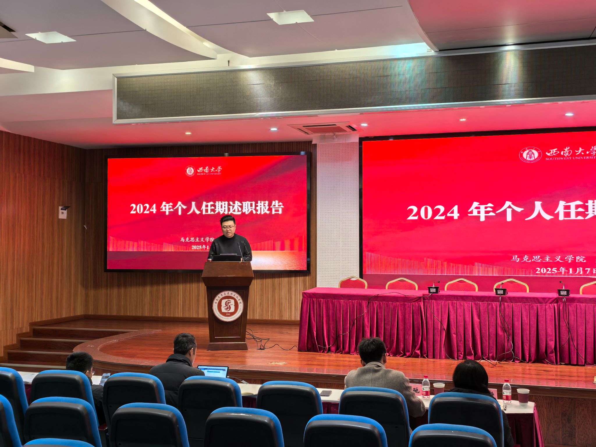 会上,学院党委书记吴文杰先代表领导班子从2020年1月至2024年12月任期主要工作业绩、存在的主要问题和主要原因以及下一步的工作打算三方面进行述职。他指出,班子在开展主题教育、推进党建标杆院系建设以及重点马院建设方面取得显著成绩,同时也指出学院领导班子建设和学院工作中存在的不足以及下一步的工作打算。2025年学院将继续坚持问题导向和目标导向,以学习贯彻党的创新理论为首要政治任务,以深入推进新时代“红岩先锋”变革型组织建设为突破口,全面推进党建与事业发展“一融双高”。