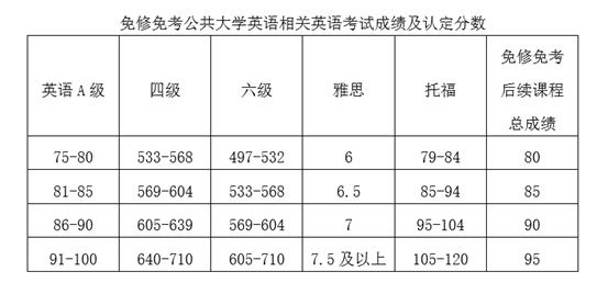 第十八条 全日制本科学生在校期间,参加全国大学英语四、六级考试(简称“四级”、“六级”)、雅思考试、托福考试,或艺体类学生、“双少生”(由学校招生部门认定的少数民族地区的少数民族学生,下同)参加重庆市英语应用能力A级考试(简称“英语A级”),达到相应分数的,可申请一次免修免考公共大学英语后续课程并认定成绩,后续课程的总成绩按下表对应记载,成绩作相应备注,且获准免修免考的公共大学英语课程不能重复申请。