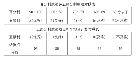 (二)考试采用百分制评分,考查采用百分制或优秀、良好、中、及格、不及格五级制(教务系统分别记为A、B、C、D、E)评分。百分制成绩和五级分制成绩需要转换时按下表进行: