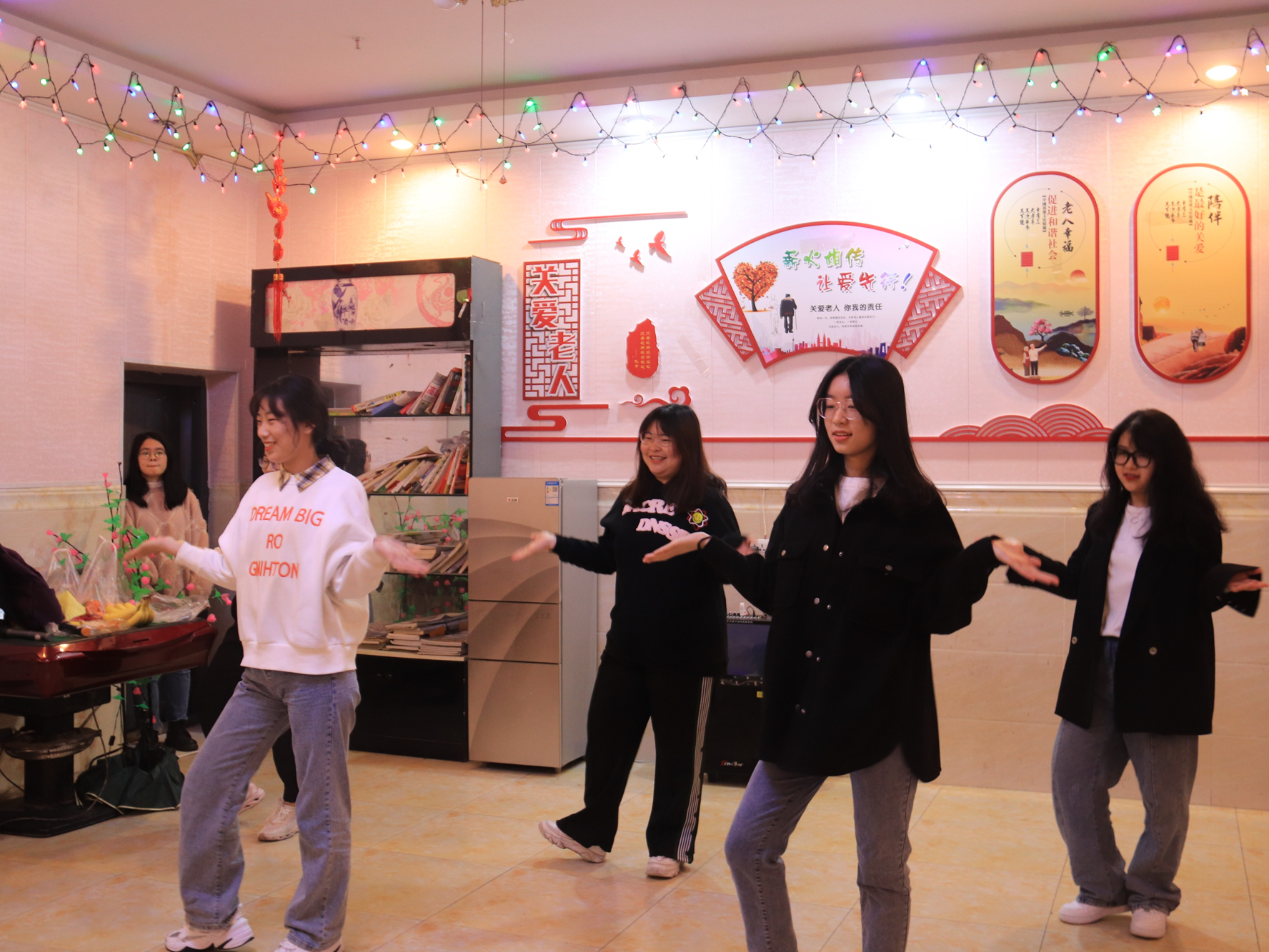 志愿活动一开始,志愿者将买好的水果分发给老人。分发完毕后,八支志愿小组开始表演节目。八个节目内容精彩、特色突出:歌曲《以雷锋的名义》作为开场;歌舞串烧表演,活泼俏皮,气氛活跃;充满活力的啦啦操舞蹈与精彩的京剧表演相结合,传统与现代的完美结合;邓丽君歌曲串烧唤起爷爷奶奶的记忆,也跟着轻轻吟唱;歌舞《雷锋精神放光芒》、情景剧《雷锋的故事》向我们讲述雷锋的故事,颂扬雷锋的精神。