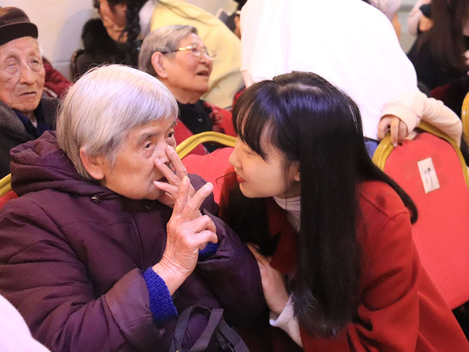在表演结束后,志愿者们或蹲在一边,围成一圈与爷爷奶奶们聊天,耐心地听他们讲过去的故事;或送已经疲惫的爷爷奶奶回房休息;或给行动不便而没能到场看表演的老人们送水果,看望他们,陪他们说会儿话,给他们送去志愿者们的一些心意。