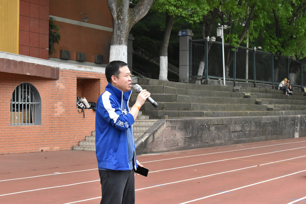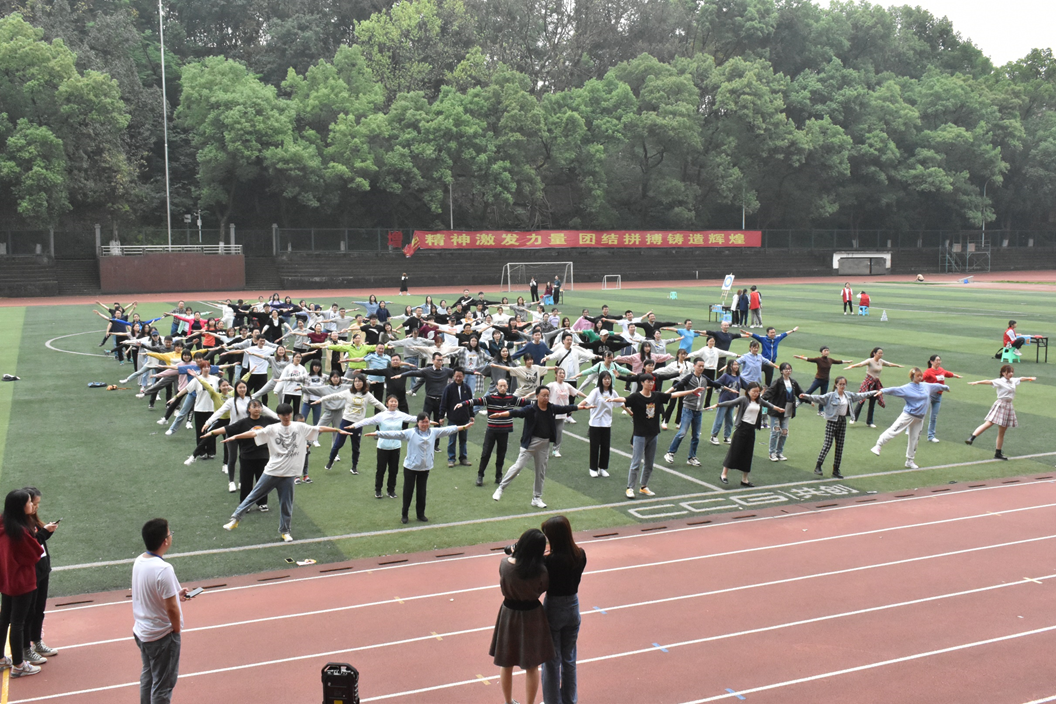 14时30分,在主持人介绍整场运动会规则之后,学院党委常务副书记廖晓衡书记致辞,正式宣布师生趣味运动会开始。首先进行热身环节,全体齐跳第九套广播体操。老师和同学们的动作整齐划一,展现出了昂扬向上的精神风貌。