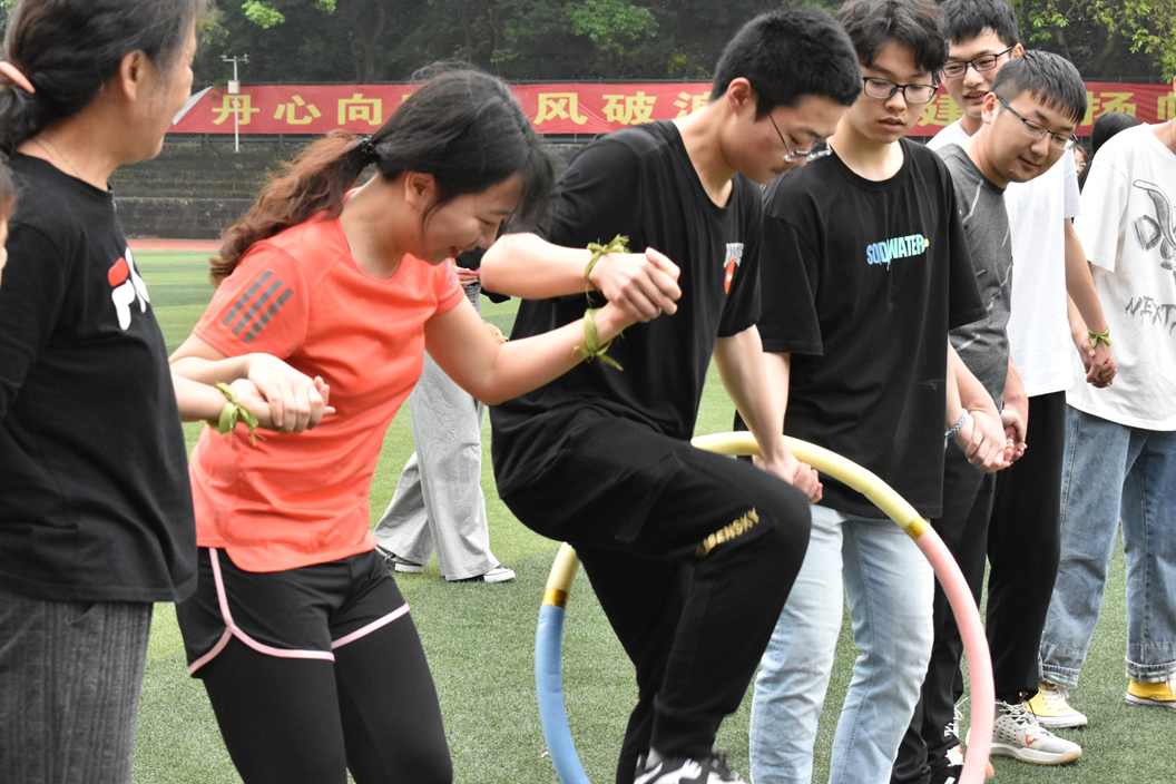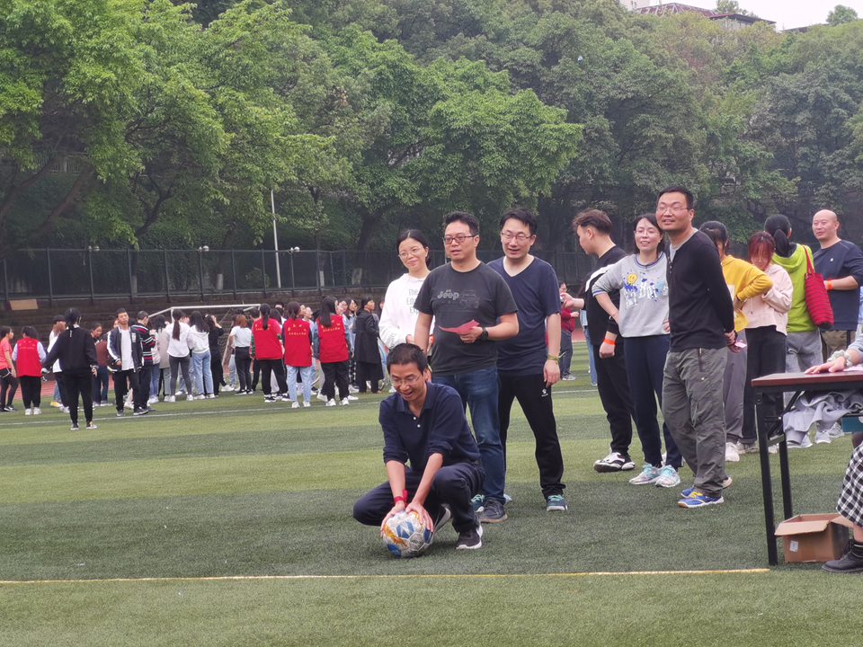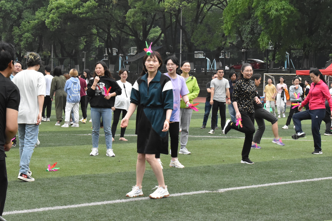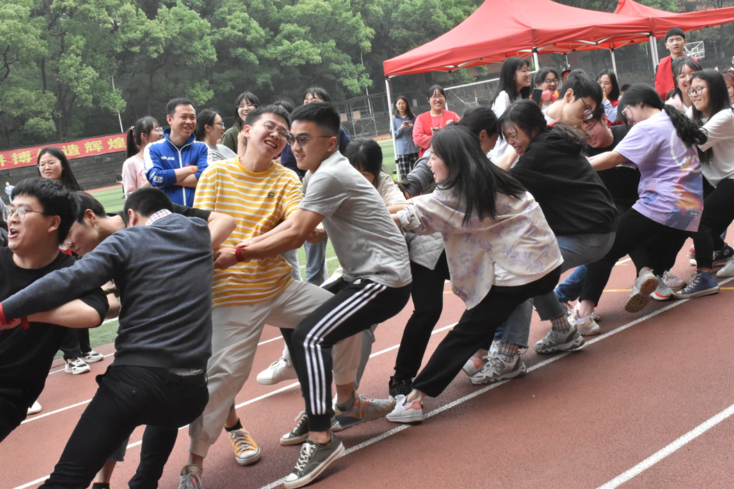 热身环节过后,四支队伍进入了集体游戏环节。在“争分夺秒”游戏中,师生们脚绑气球,限时在规定区域内踩对方队伍的气球,气球一个接一个地被踩爆,点燃了趣味运动会热烈的氛围。在“千帆竞渡”游戏中,各队队员在圆环条幅内滚动圆环前行,一个个“无敌风火轮”冲锋向前。游戏“戮力同心”,每队派出10人站成一排进行呼啦圈传递。师生们配合默契,动作灵敏,迅速完成了来回传递呼啦圈。游戏“爬雪山,过草地”,师生们进行滚铁环接力,一个个路障带来了不小麻烦,师生们欢笑连连!在 “百花齐放”游戏中,各队代表限时踢毽子,老师们或可爱或淡定,学生们也青春洋溢,为自己团队贡献出自己的力量。最精彩的莫过于“砥‘力’前行”游戏了,四支队伍抽签进行拔河比赛。一听到“开始”,双方卯足了劲向后方仰,“1、2、1、2……”的整齐口号和观众们大喊加油的热情鼓舞,让此次师生趣味运动会的气氛到达高潮,也为集体项目带来了一个圆满的结束。