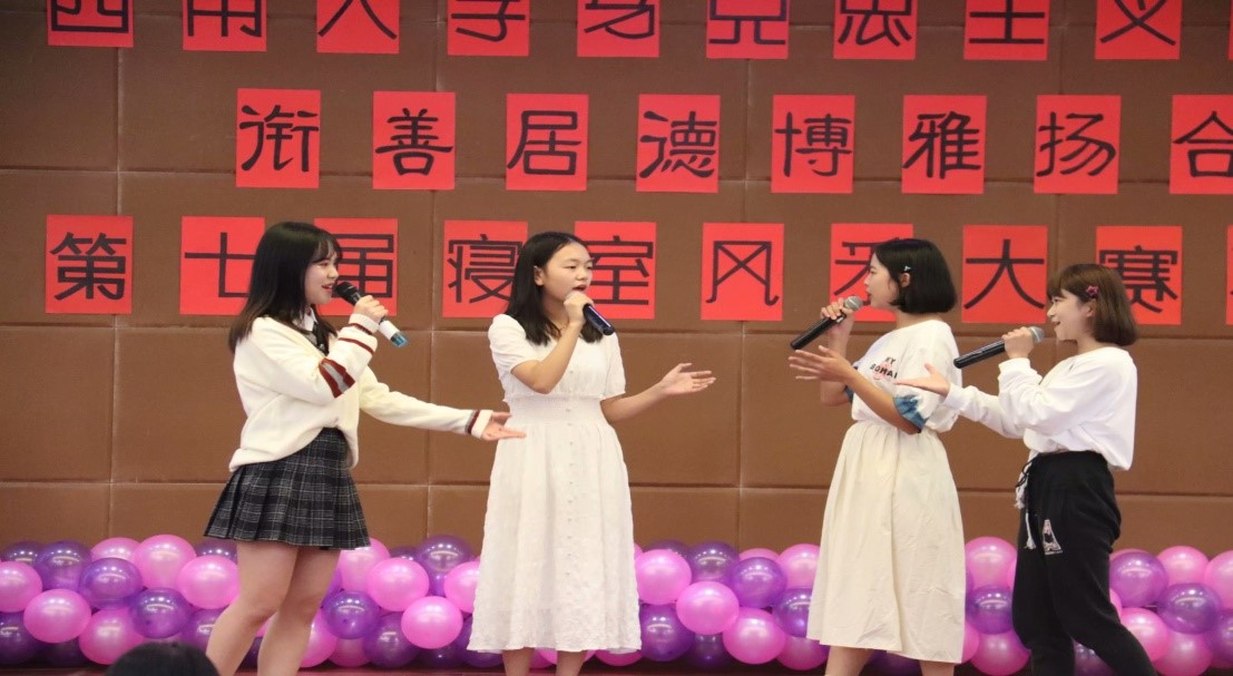 紧接着,大赛来到第二个环节。歌舞表演《倔强的青春》让我们领悟到青春始终是一场锐不可当的奋进力量;《相识 相交 相离》让我们认识到缘分的奇妙;119寝室的歌曲串烧带我们回顾童年记忆;《明日亦少年》让我们敢于追逐;《遇见,有幸》让我们认识到友谊的美丽;歌曲串烧《福娃之歌》将深情、俏皮与决心相结合,让我们领略到大学生的青春活力;而桃一412五人配合默契,带来的普通话与重庆话结合的青春情景剧《宿舍那些事儿》,让大家在方言与普通话夹杂而产生的欢声笑语中体味到了我们普通却趣味横生的大学生活;在歌舞《遇见遥远的你》中,橘七602的四名男生用灵动的舞蹈征服了评委与观众。八个寝室的风采展示各具特色,精彩纷呈,为观众们带来了一场视听的饕餮盛宴!