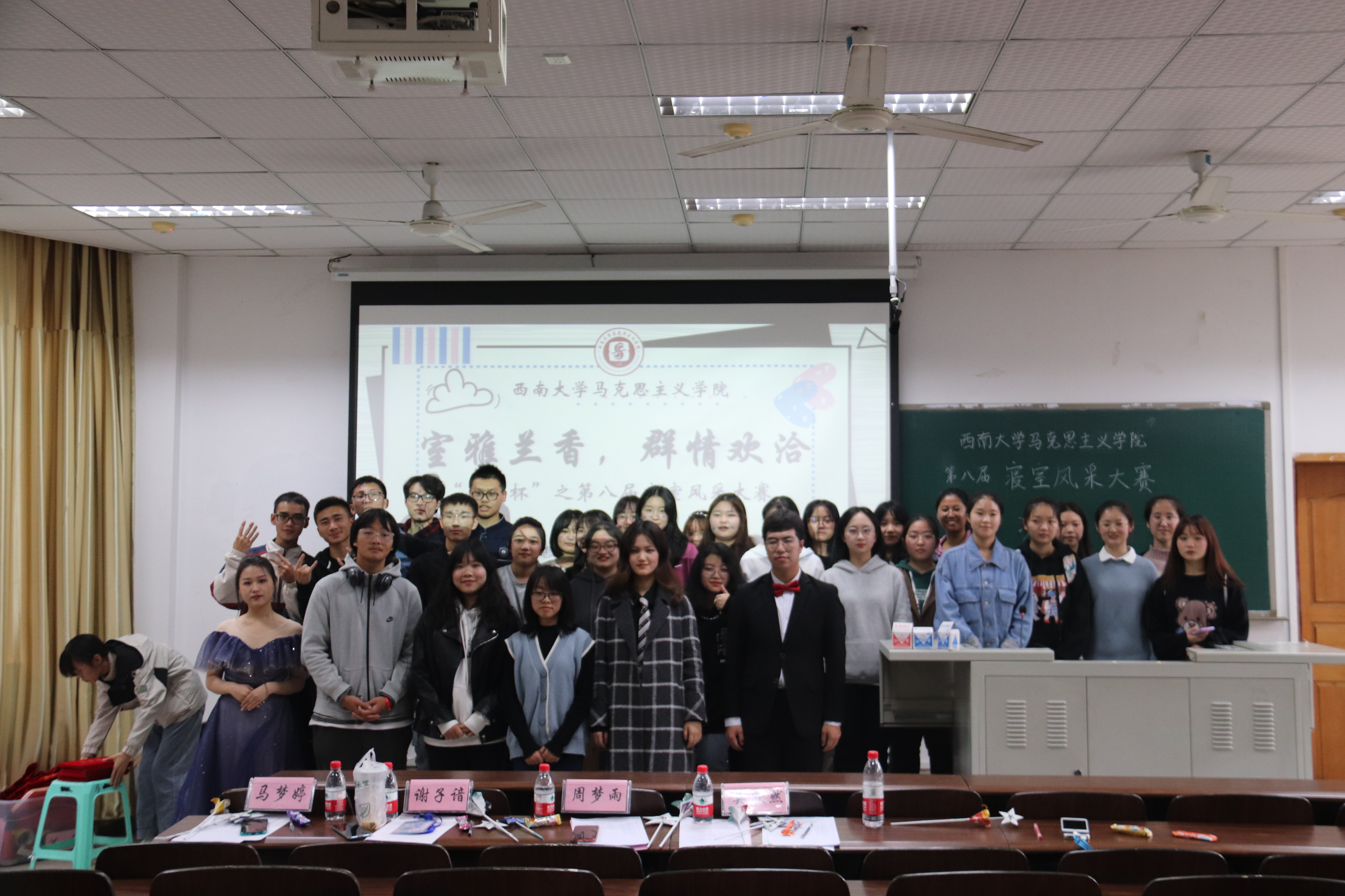 PPT展示结束后,大赛来到第二个环节——寝室风采展示环节,在这个环节中,参赛选手展现了更具生活气息的一面,下面让我们大家一起来看看马院学子的风采吧!可可爱爱,没有脑袋,本真自然,欢乐无限!桃园六舍217寝室的小品幽默诙谐,让人捧腹的同时,更让人感受到217寝室六个男生的友谊,成功赢得了全场喝彩。318寝室别出心裁,给大家带来了歌舞串烧《土嗨の王》,动听的歌曲,可爱的舞蹈,给同学们带来了极致的土嗨感觉。人生如戏,走过重重迷梦,恬淡,静好的阳光却依旧和煦如初。309的表演《夜空中最亮的赤子心》让人感受到了梦想和坚持的力量!当来自五个地方的五个不同民族碰撞在一起,会产生什么奇妙的化学反应呢?311寝室的表演《奇妙大串烧》让我们领略了五个民族丰富多彩的文化,领略不同民族文化的魅力。谁能抵挡得住回寝的诱惑?306的马仙女们结束了一天的忙碌生活,点上一杯奶茶,开始了她们的睡前茶话会,想知道她们在谈什么吗?快来听一听吧!306寝室的歌曲让我们感受到了她们宿舍的和谐以及她们充实的大学生活。孩子依赖着肩膀,诗人依赖着月亮,海豚依赖着海洋,316寝室的表演《仍是少年》让我们仿佛回到了那段拼搏的岁月……六个寝室的风采展示各具特色,精彩纷呈,用不同风格的表演展示了寝室特色,为在场的观众们带来了一场视听的饕餮盛宴!