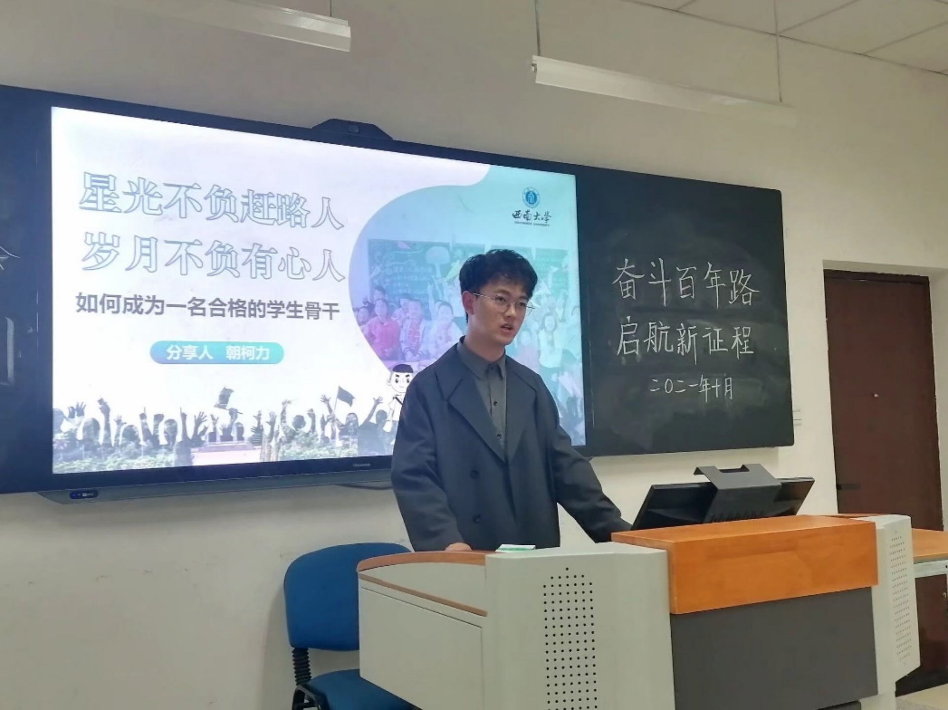 最后由朝柯力同学进行经验分享,朝柯力同学做了简短的自我介绍后指出,作为学生骨干,首先是学生,要注重自身学业,然后再投入到为同学们服务的过程中;同时,也强调了社会实践的重要性。他现身说法,用自己的亲身经历告诉大家,要身体力行,做祖国大地的耕耘者,璀璨星河中的发光者,做到知行合一,最后强调了时间运用的重要性。大家认真倾听,获益良多。
