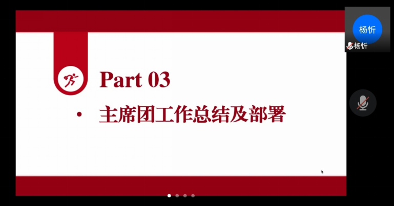 随后,yl88858永利中国第十届本科团委学生会主席团代表团委副书记杨忻同学进行了工作总结及工作部署。她重点强调了在严峻的疫情防控局势之下,学生会要坚持以线上线下联动的形式更好地开展工作;优化组织结构,加强学生会工作人员的思想建设和作风建设,坚持从同学中来到同学中去的工作方法;恪尽职守,站好最后一班岗,成为有理想有抱负有担当的人。