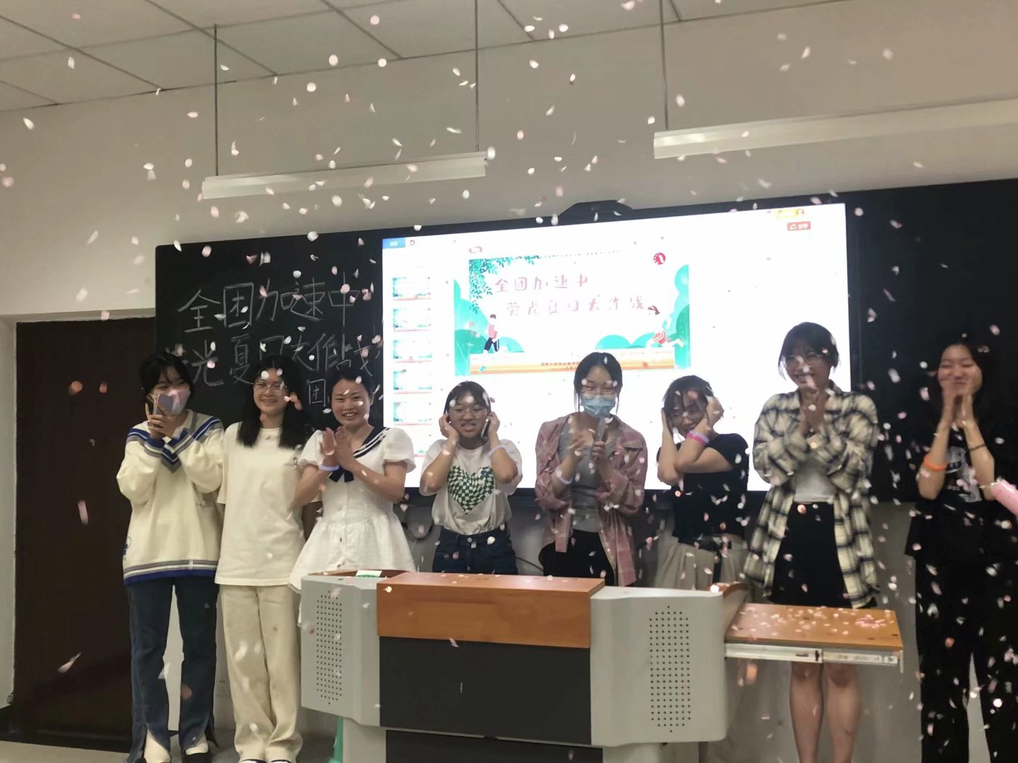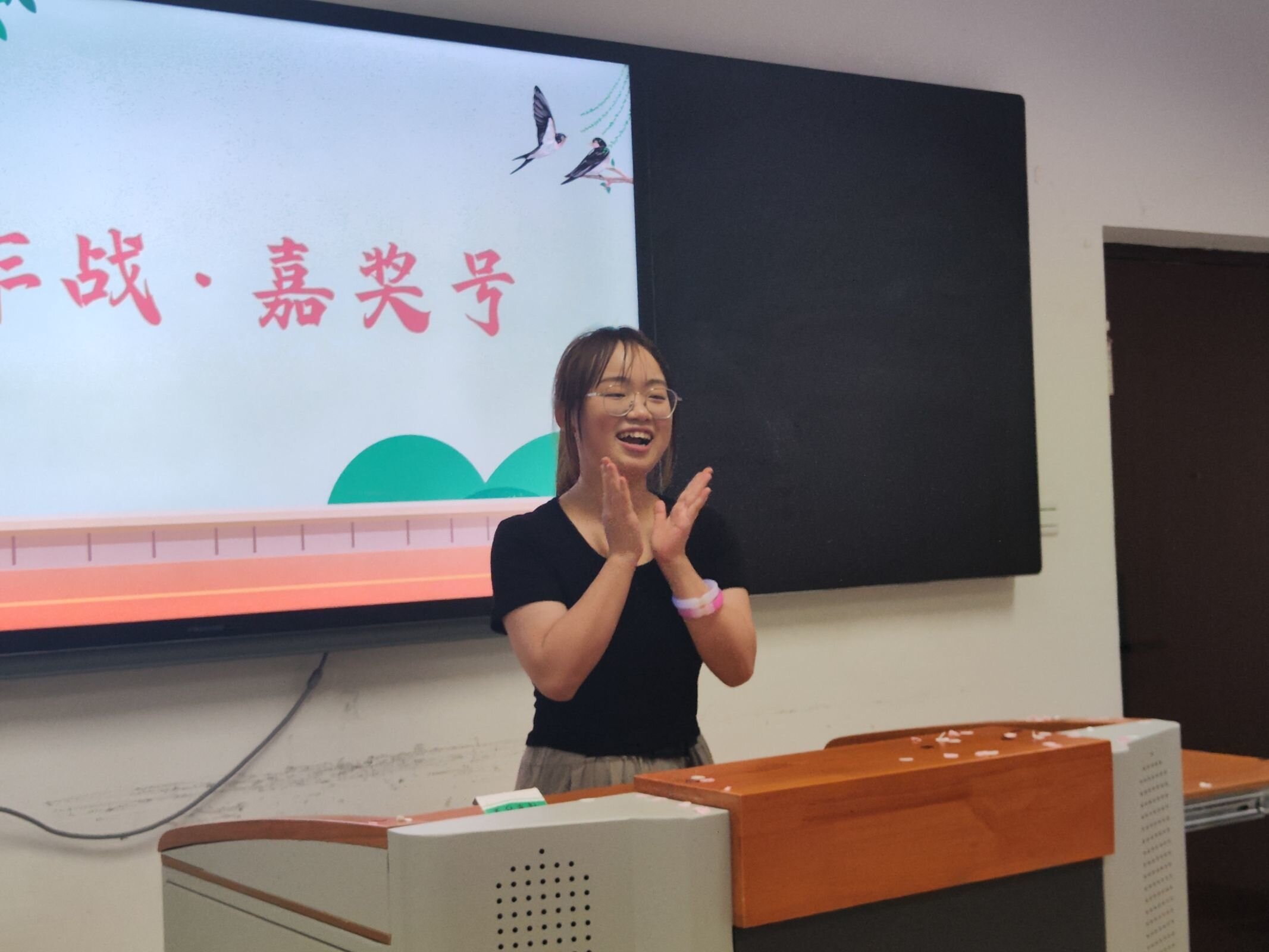 快乐的时光总是短暂的,40分钟的游戏在欢乐与刺激的氛围中很快接近了尾声,团员们在各队负责人的组织下有序地回到了yl88858永利中国研究生教室三进行短暂休息。等待游戏结果公布的间隙,工作人员杨琪和程诗雅采用现场录制VCR的形式采访了团员们对团日活动的感受以及对宣讲团的美好祝愿。镜头前,团员们恣意欢笑,畅所欲言,眉眼之间满是喜乐与温情。随着现场采访拍摄的结束,最终的积分统计结果出炉,蓝队以51分位列第一,最终获得了胜利!在热烈的掌声与欢呼声中,蓝队全体队员上台领奖。伴随着礼炮声响起,现场的氛围达到了高潮,全体团员纷纷为自己在游戏中的表现以及宣讲团浓厚的家文化而鼓掌。