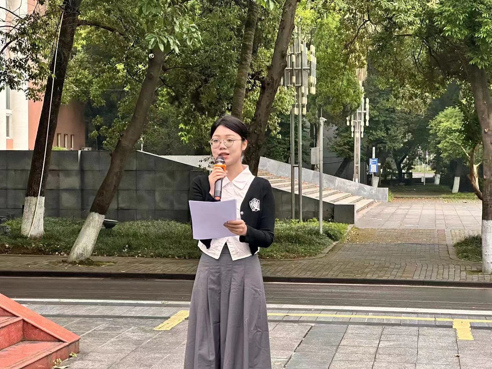 升旗礼毕,学生代表2021级本科生曾雨芊作国旗下的发言。她表示新时代青年要坚定理想信念,练就过硬本领,不畏艰难险阻,奋力书写中国式现代化的青春篇章。曾雨芊同学还共勉马院学子,要怀抱无比的自信,拼搏向前,竭尽全力施展抱负,建功立业。