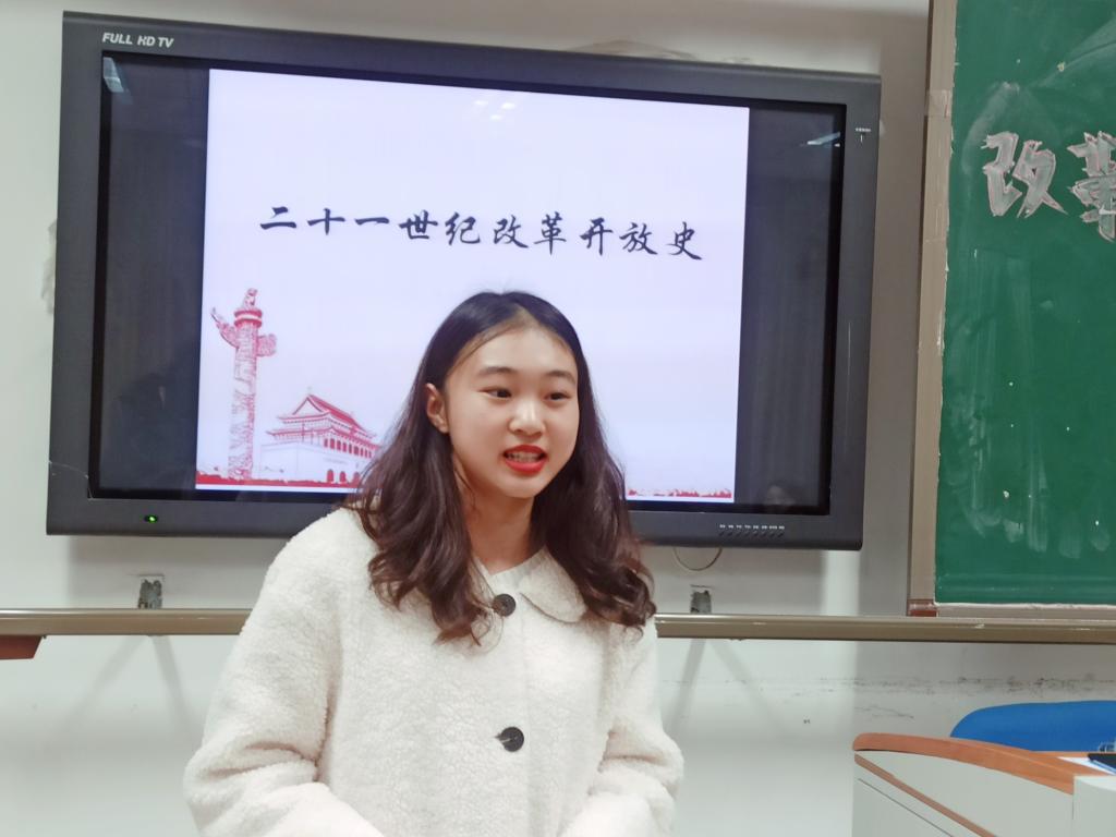 在第二环节“博物馆之旅”中,学研部的三名团员化身博物馆讲解员,分别对改革开放不同时期的发展变化进行生动讲述。在《改革开放1980》展厅中,王府魁同学向我们讲述了春天的故事:从蛇口工业区的动工,到五个经济特区的建立;从结婚四大件“三转一响”,到酒席上的大白兔奶糖,这一个个重要的历史时刻,一件件物品,让团员们深刻体会到,改革的春风,让人们的生活越来越好,让我国的经济走向繁荣;在《改革开放的九十年代》展厅中,赵文琪同学向我们介绍了二十世纪九十年代浦东的改革与发展:1990年,“浦东大开发”启程;1990年底,股票正式开始交易,将以市场化的方式利用我们的资金发展经济;1992年的南方谈话,让中国的发展走向开放吸收和改革创新;在《21世纪改革开放史》展厅中,倪莎同学从经济、交通两方面为大家展现新世纪上海改革开放的种种成果:上海自由贸易区助力中国经济体制改革和市场进一步开放;轨道交通的完善将浦东与浦西紧密联系在一起,共同进步,发展。在讲解员们的精彩讲述和与团员们的互动中,团员们身临其境,与历史对话,对改革开放四十年来的发展变革有了更清晰的认识,更深刻的体会。