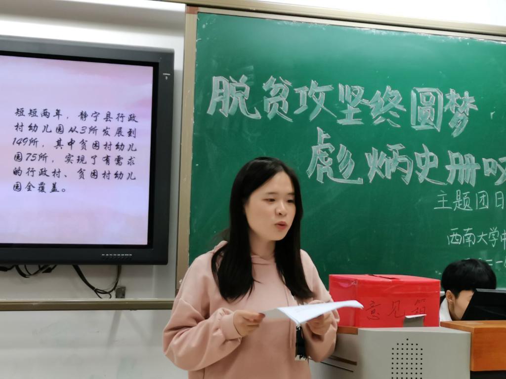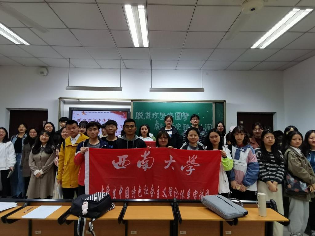 贫困是人类社会的顽疾,反贫困始终是古今中外治国安邦的一件大事。为深入了解脱贫攻坚的卓越成就,使团员加深对中华民族伟大复兴中国梦的理解,切实感悟党的初心使命,大力弘扬脱贫攻坚精神,yl8858永利集团大学生中国特色社会主义理论体系宣讲团团支部(以下简称“学生宣讲团”)于3月23日22:10在yl88858永利中国研究生教室一开展了以“脱贫攻坚终圆梦,彪炳史册叹人间”为主题的团日活动。