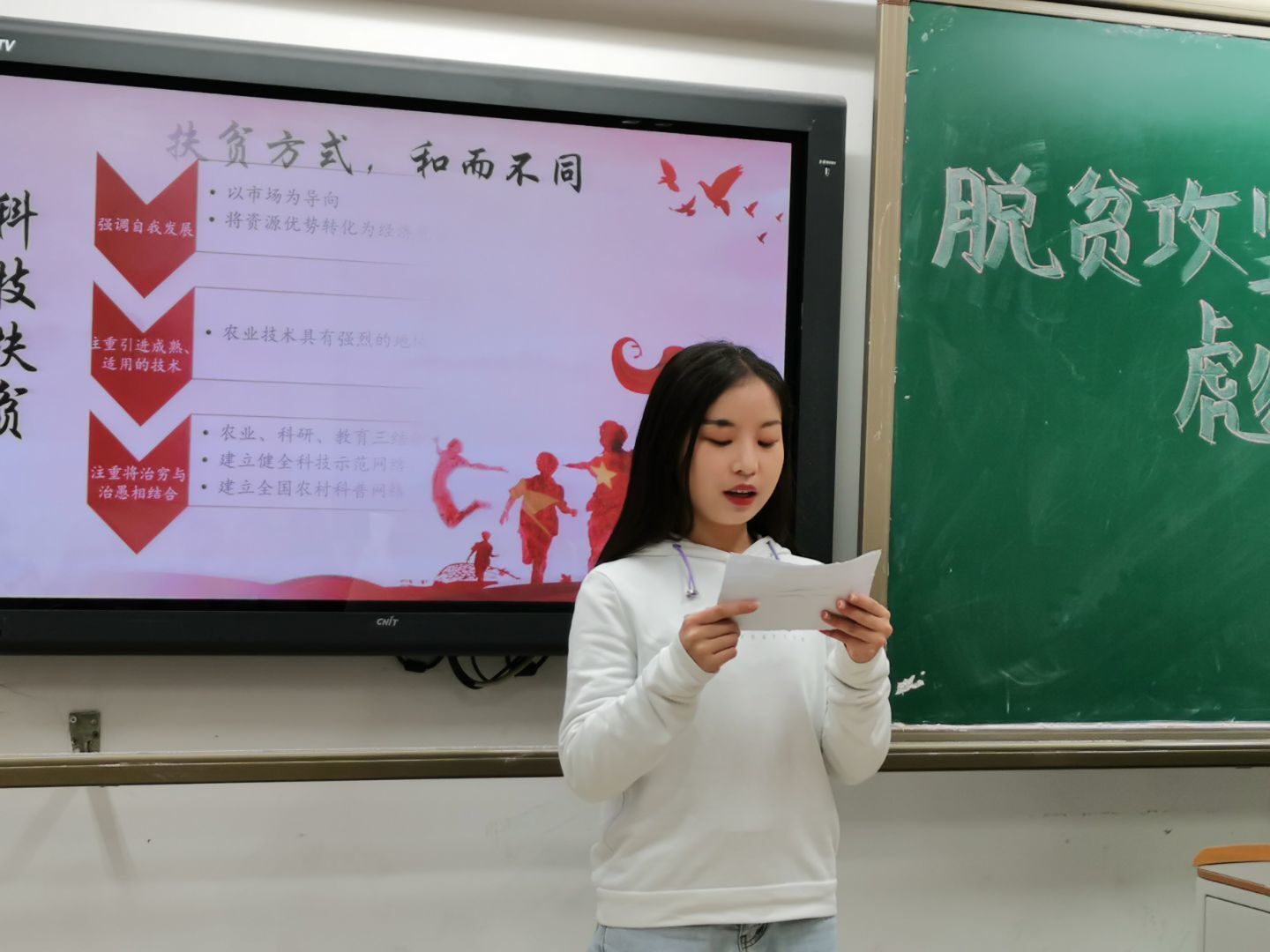 观看完视频后,活动进入到了第二环节“借凌云风,圆脱贫梦”。本环节由三位讲解员从26个字母出发,分别从领域、方式和主体三个角度为大家解读脱贫攻坚的制胜密码。首先,团员石萌为大家着重讲解了教育扶贫和科技扶贫两个重点领域,让大家感悟到脱贫攻坚战中科技和教育在治穷与治愚中发挥出的强大力量。
