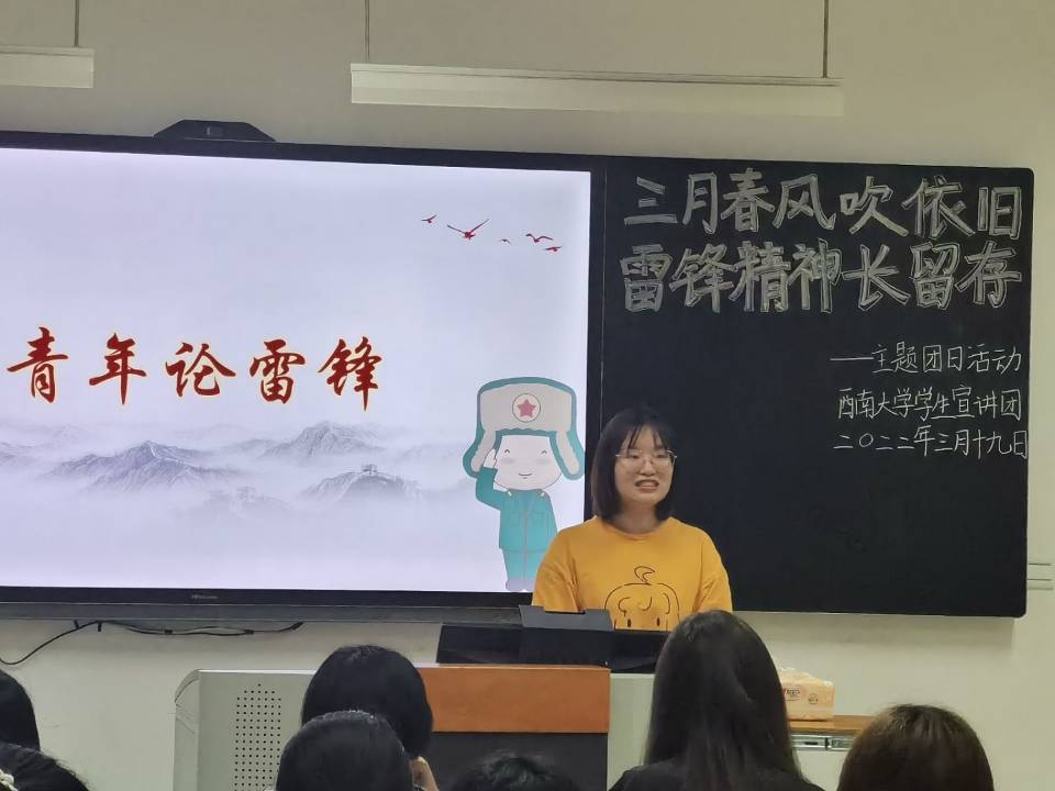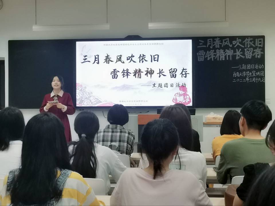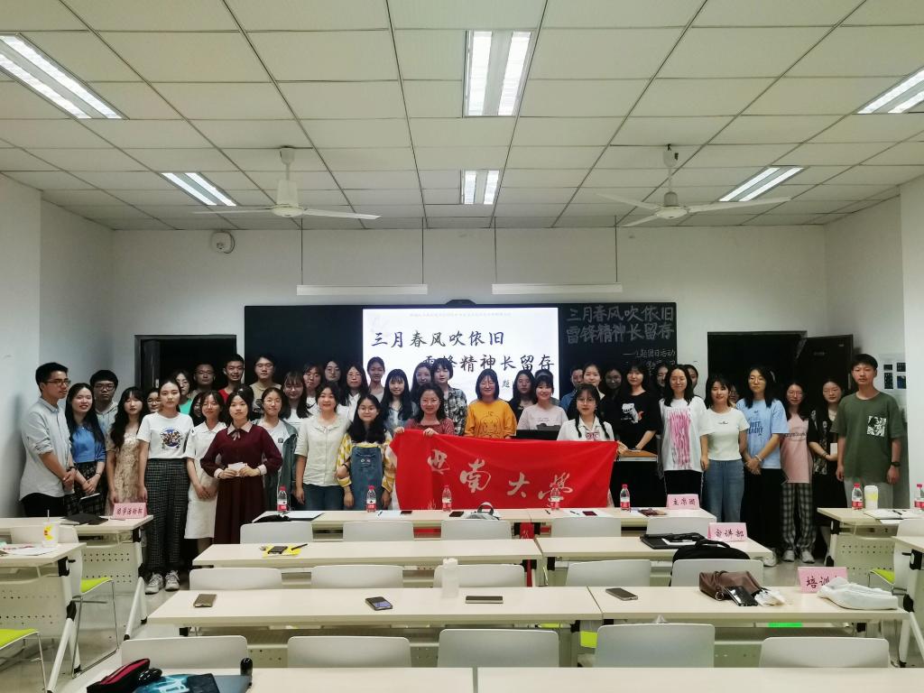 陈毅曾这样赞美雷锋:“雷锋,一个普通的士兵,成了亿万人民学习的典型。这件事非同小可,它是一场真正的思想革命。”诚然,雷锋精神于每个人都有重要意义。为推动团员深入学习伟大的雷锋精神,感悟其无私奉献和爱党爱民的丰富内涵,并将雷锋精神进一步贯彻落实到生活中,yl8858永利集团大学生中国特色社会主义理论体系宣讲团团支部(以下简称“学生宣讲团团支部”)于3月19日19:00在yl88858永利中国研究生教室一开展了以“三月春风吹依旧,雷锋精神长留存”为主题的团日活动。