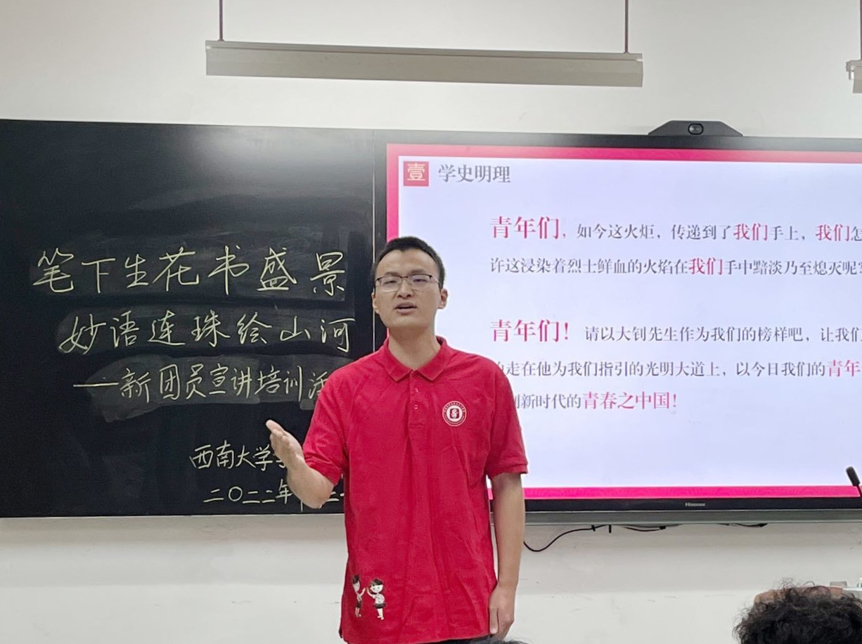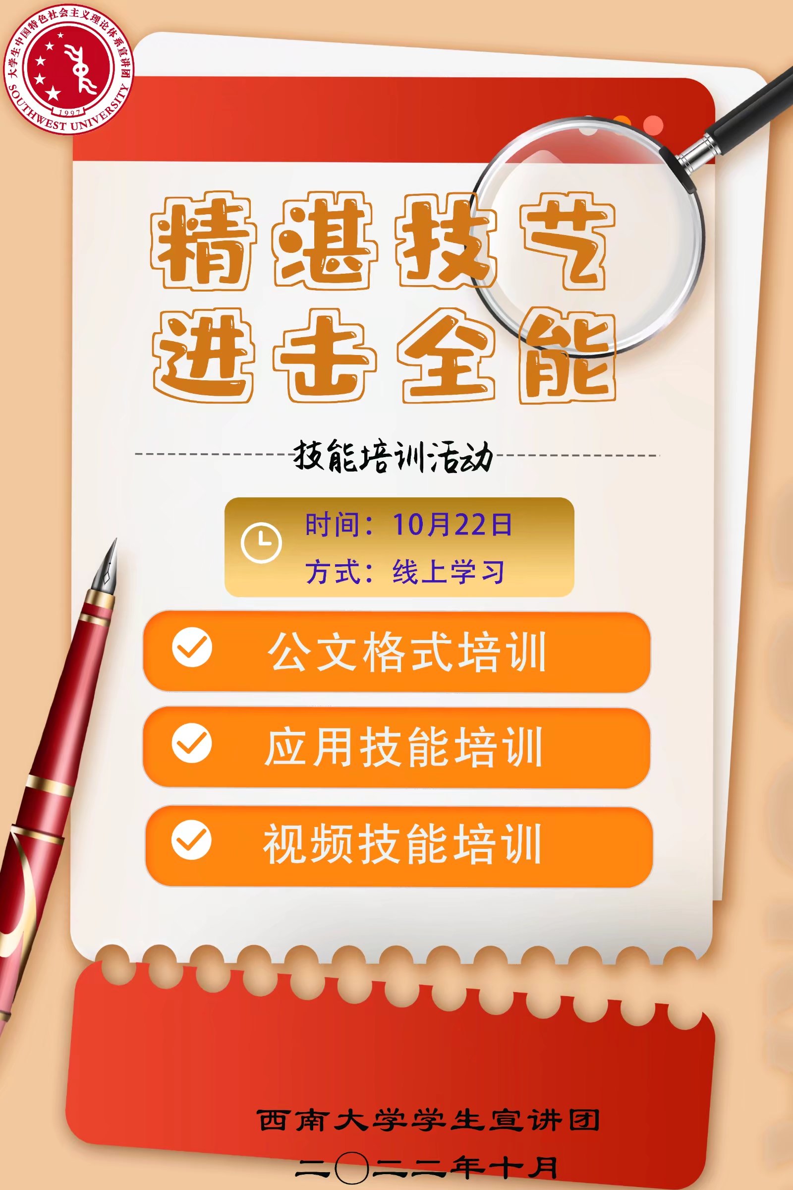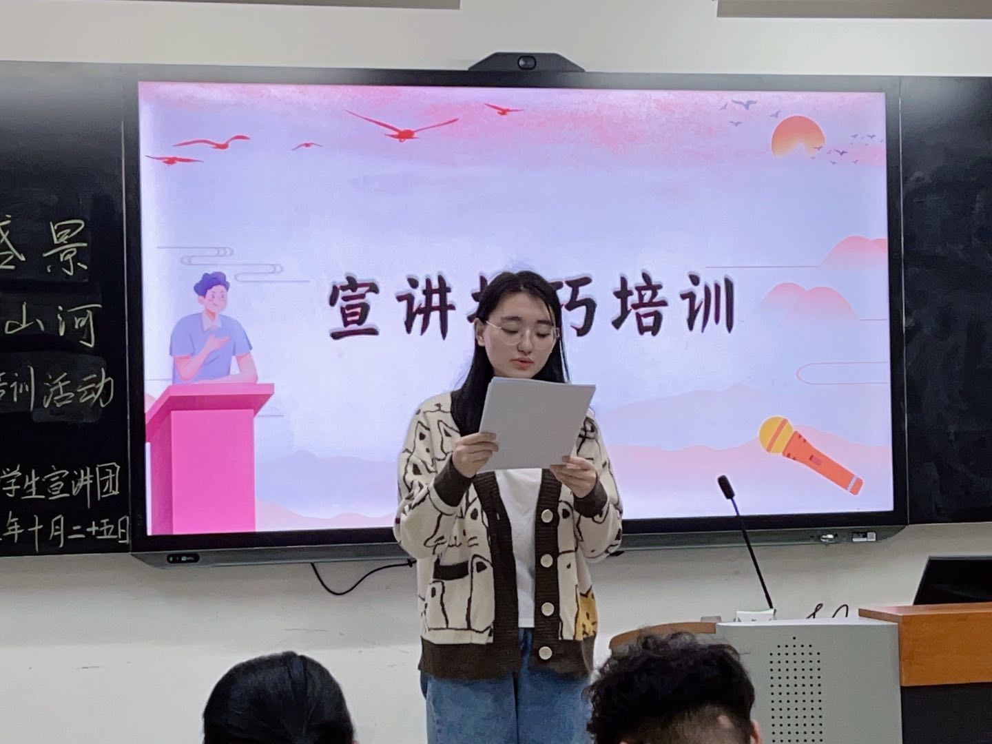 10月26日,“笔下生花书盛景,妙语连珠绘山河”宣讲技巧培训活动在yl88858永利中国研究生教室一举办。在第一个环节中,第25届优秀宣讲员罗国梁为新团员们带来示范宣讲《置身混沌 探求光明》,快板队成员为团员们带来精彩的快板舞表演;随后,宣讲部部长刘钰煊对新团员们做了宣讲技巧与撰稿培训,培训部副部长张颖和部长符玉玉分别为团员们做了宣讲礼仪培训以及快板培训。作为学生宣讲团的一员,每一位小宣人都承载着用笔墨描绘盛世,以宣讲传递真理的责任。通过本次培训,相信新团员们都已初步掌握相关技巧,在之后的宣讲过程中必将不断苦练技能、提高能力,走在传播真理的最前沿和理论宣讲的第一线。