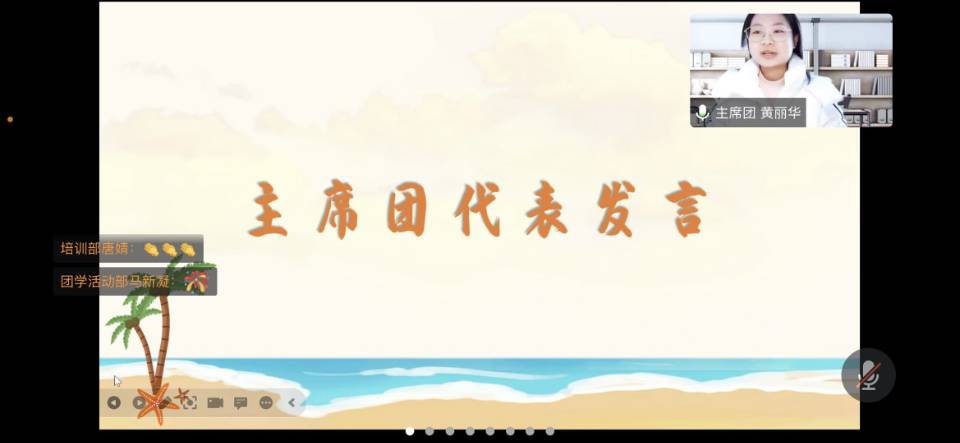 之后主席团代表黄丽华向全体团员作学生宣讲团2022-2023秋季学期工作汇报,并在汇报中提到:作为学生宣讲团的一员,我们更应该感到责任重大,学习宣传贯彻党的二十大精神任重道远,砥砺团员们不忘来时路,走好脚下路,展望未来路。