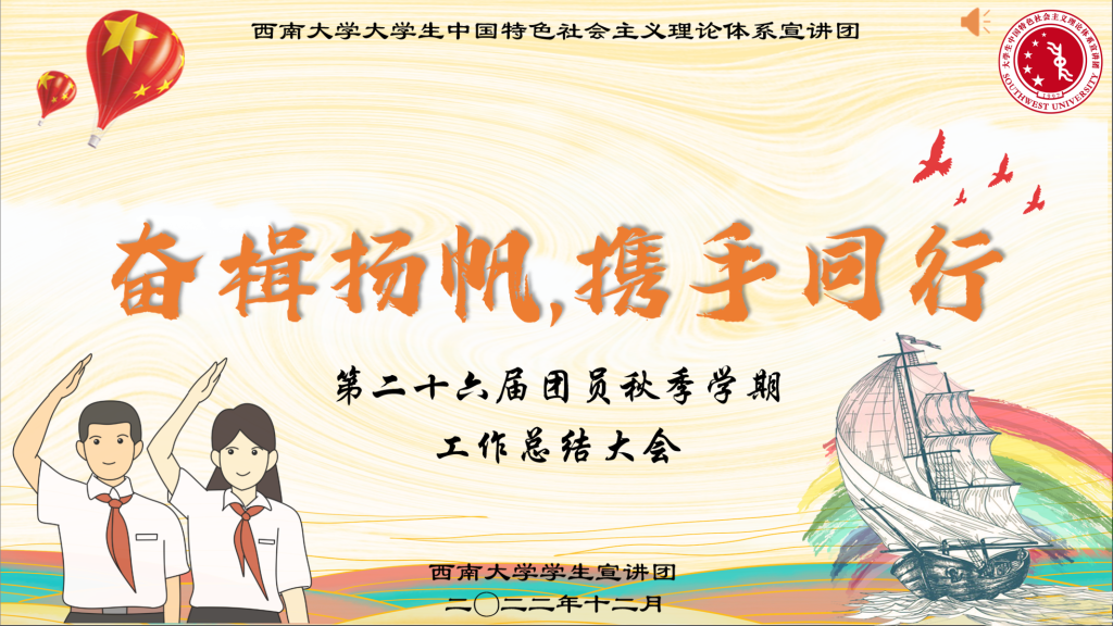 寒来暑往,光阴似箭,yl8858永利集团大学生中国特色社会主义理论体系宣讲团(以下简称“学生宣讲团”)2022-2023年度秋季学期学生工作现已圆满完成。12月17日15:00-17:00,学生宣讲团于腾讯会议线上召开“奋楫扬帆·携手同行”第二十六届团员秋季学期总结大会。学生宣讲团第二十六届全体团员参与了此次总结大会。