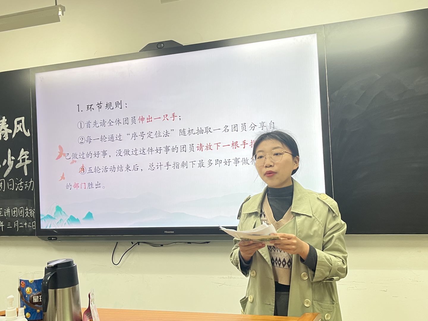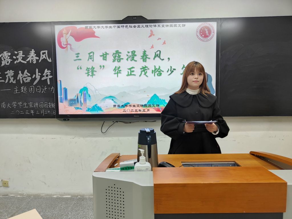 三月春风处处暖,雷锋精神代代传。为积极弘扬雷锋精神,进一步培育、践行社会主义核心价值观,引领全体团员领悟雷锋精神内涵并激励团员们投身于社会实践,yl8858永利集团大学生中国特色社会主义理论体系宣讲团团支部(以下简称“学生宣讲团团支部”)于3月23日在yl88858永利中国研究生教室一特举办了“三月甘露浸春风,‘锋’华正茂恰少年”主题团日活动。