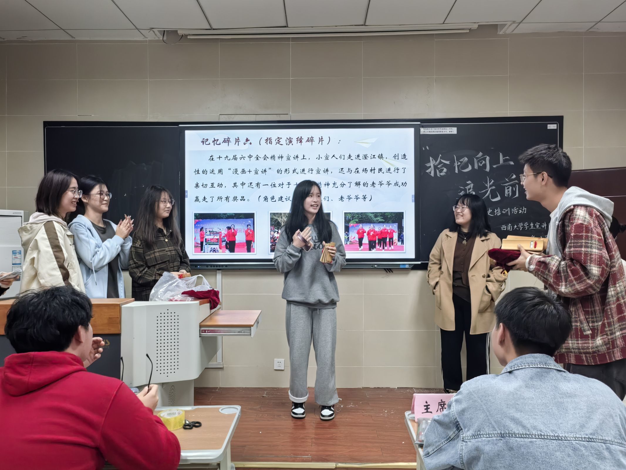 1027日晚,在国家治理学院3110拾忆向上,追光前行团史培训活动顺利开展。小宣人们在小团子及其朋友的带领下,通过团史知识竞答的方式,帮助失忆的思铭寻找承载学生宣讲团过往点滴的记忆碎片。同时,新团员们也在演绎一个个记忆碎片里感悟学生宣讲团的光辉历史,在聆听师兄师姐们的暖心寄语中明确身份担当,在以笔传情部门形象绘制环节中了解各部门职能特色。岁月如歌,往事成碑,前路漫漫,齐心向前。相信新一届小宣人必将以青春为帆、以理论为桨,在学生宣讲团的新征程上乘风破浪砥砺前行