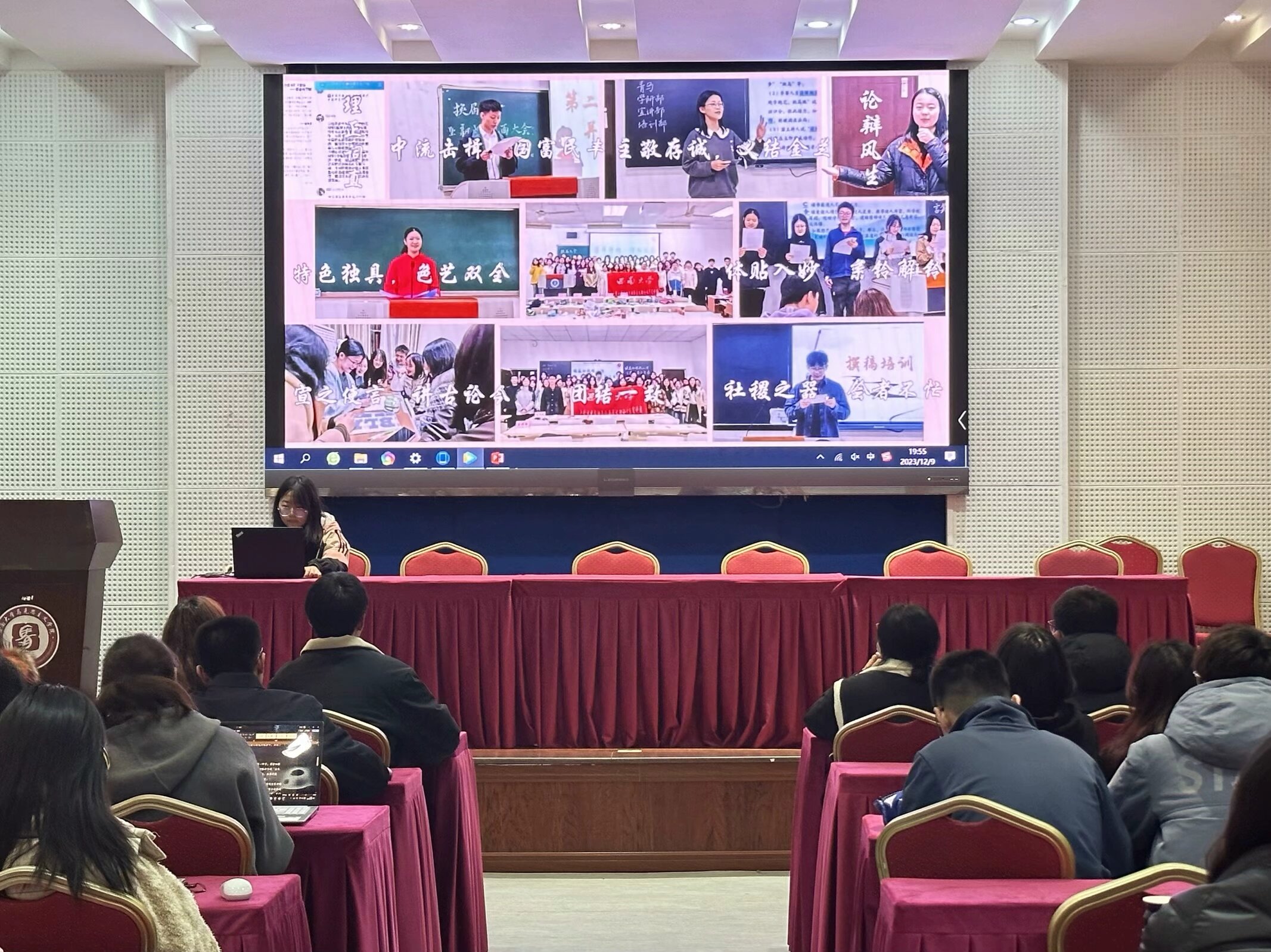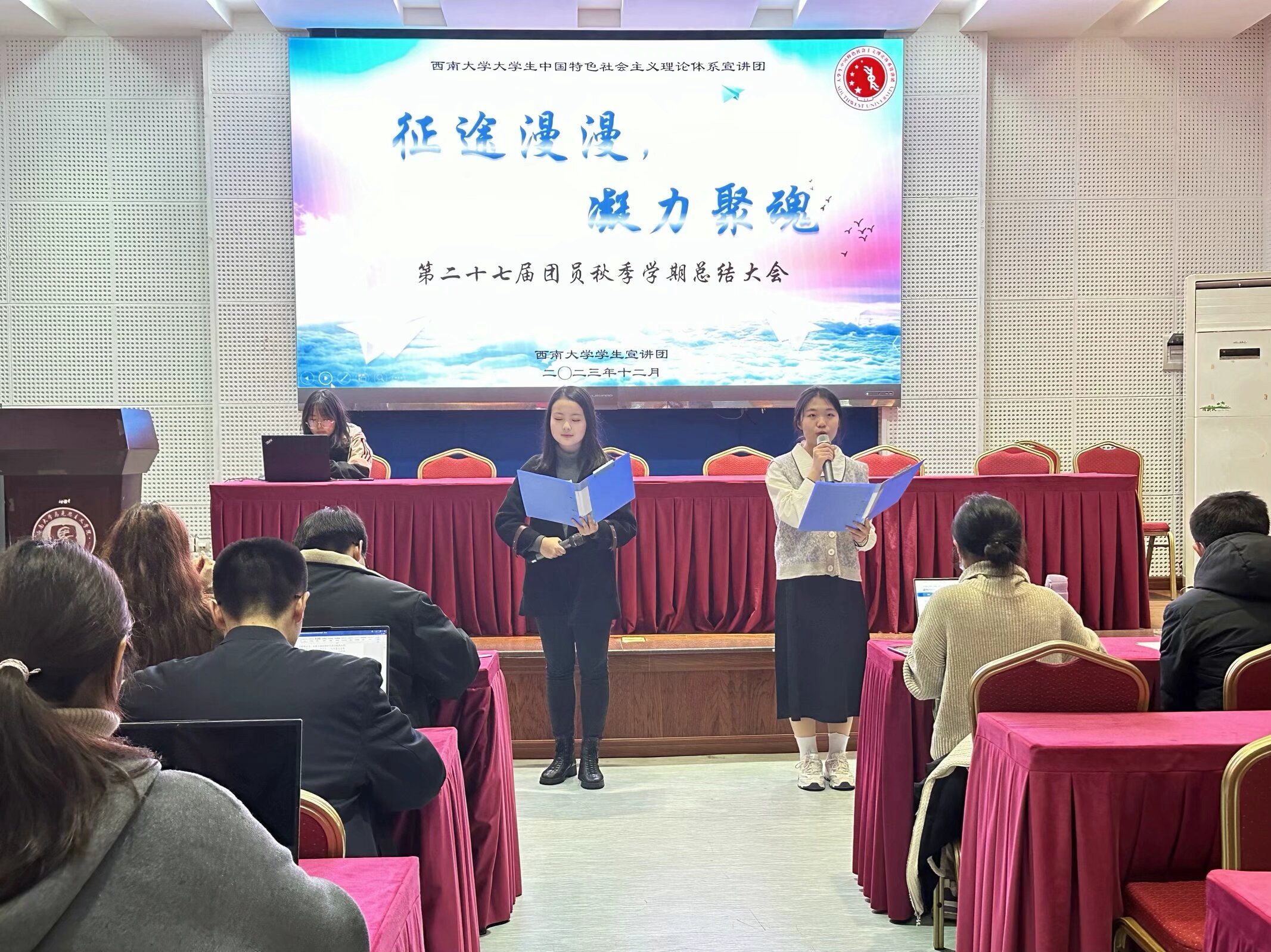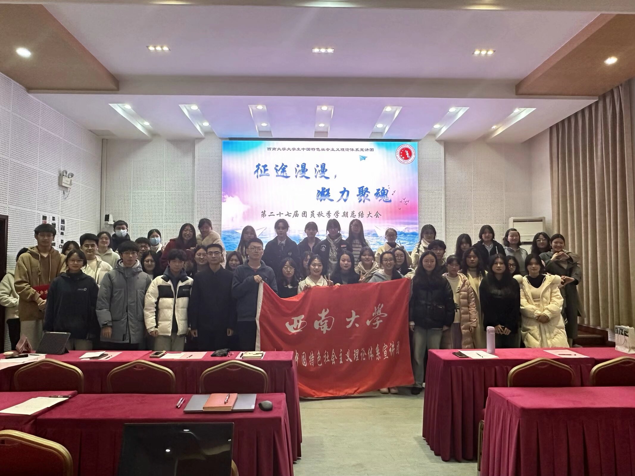 2023年12月9日晚,yl8858永利集团大学生中国特色社会主义理论体系宣讲团(以下简称“学生宣讲团”)在yl88858永利中国501报告厅举行了“征途漫漫·凝力聚魂”第二十七届团员秋季学期工作总结大会。本次活动总结了学生宣讲团过去一学期的工作成果,并对下一阶段的工作进行了总体规划,同时也加强了各部门间的交流与合作,促进了学生宣讲团的“家文化”建设。