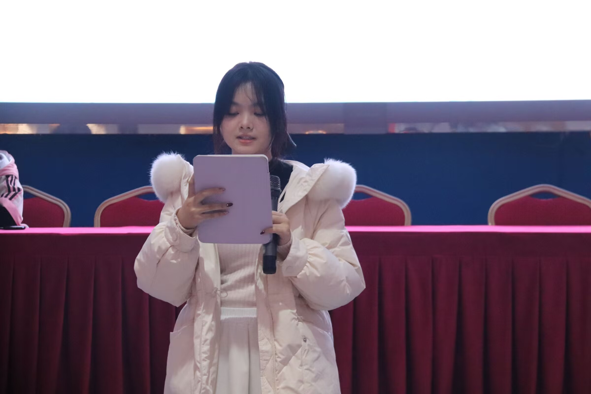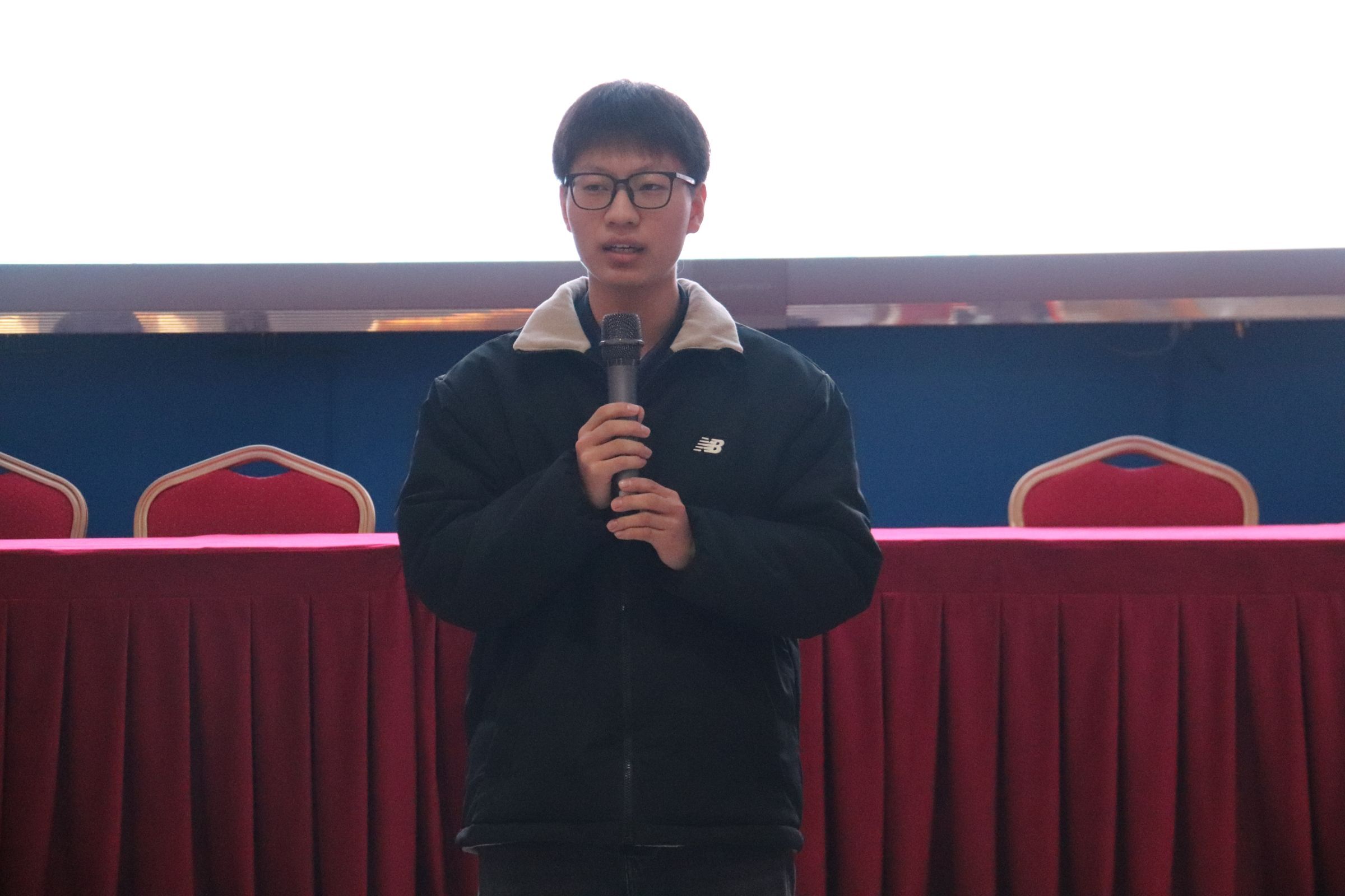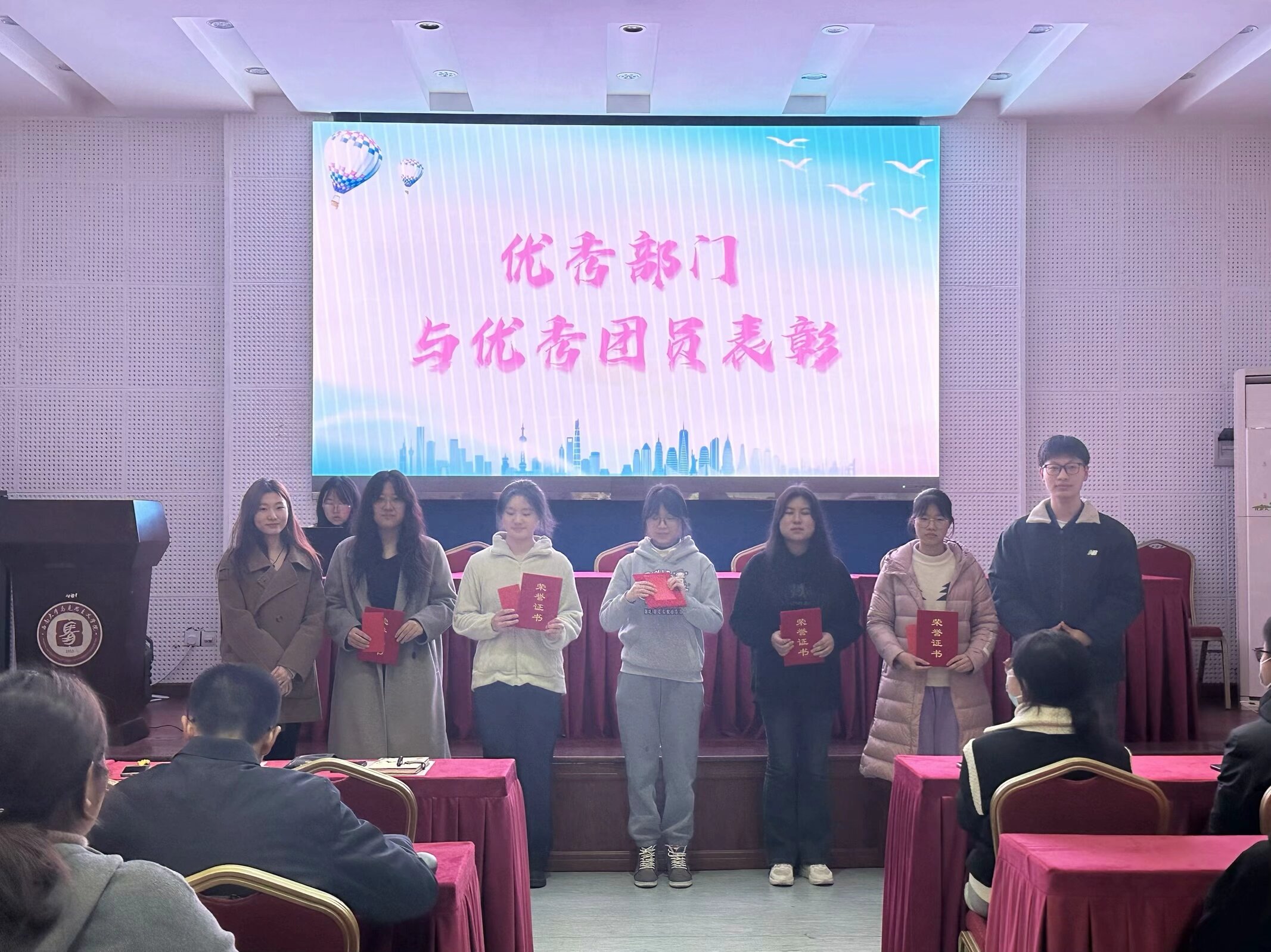 之后是优秀部门与优秀团员表彰环节,这一环节使得现场气氛达到了高潮。主持人公布优秀团员及优秀部门名单,恭喜办公室韩德贞、青马微声运营中心刘菊华、团学活动部黄雨沙、学研部伍琛妤、宣讲部王艺雯、培训部何沛津这六位团员荣获“优秀团员”称号,也祝贺青马微声运营中心和培训部这两个部门荣获“优秀部门”称号。这份荣誉是对他们在过去一学期辛勤付出的认可和肯定,团员们以热烈的掌声向他们表达了祝贺。随后优秀部门代表黄诗睿以及优秀团员代表何沛津发表了感言。