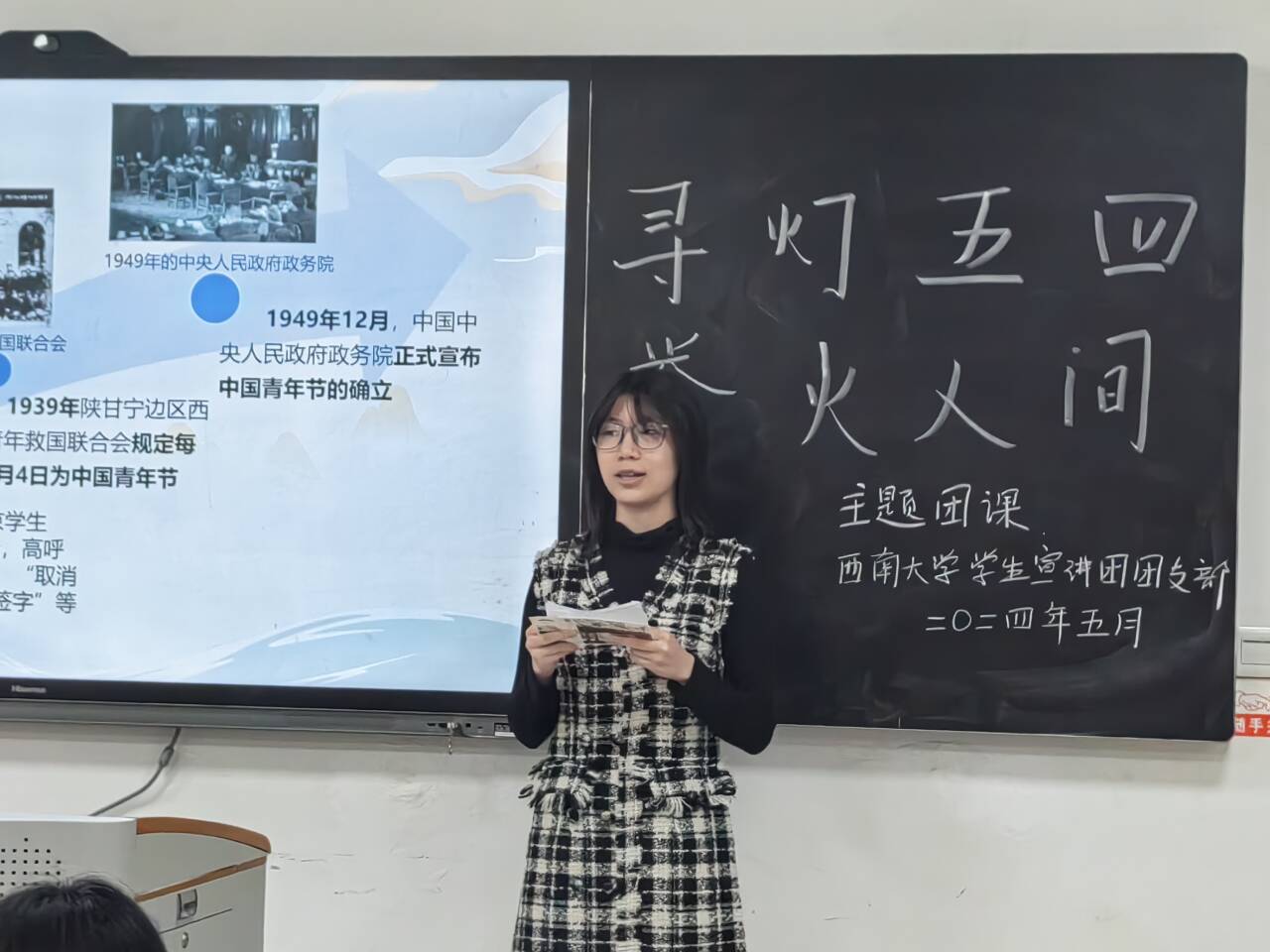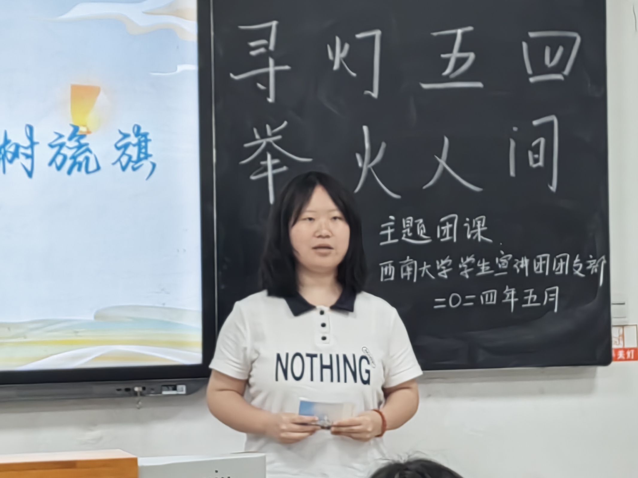 习近平总书记在纪念五四运动100周年大会上指出:“五四运动时,面对国家和民族生死存亡,一批爱国青年挺身而出,全国民众奋起抗争,誓言‘国土不可断送、人民不可低头’,奏响了浩气长存的爱国主义壮歌。”在五四运动105周年之际,为引导团员发扬五四精神,明确新时代中国青年的使命担当,凝聚干事创业的磅礴伟力,yl8858永利集团大学生中国特色社会主义理论体系宣讲团团支部(以下简称“学生宣讲团团支部”)于5月6日22:10在研究生二教室举办了“寻灯五四,举火人间”主题团课。