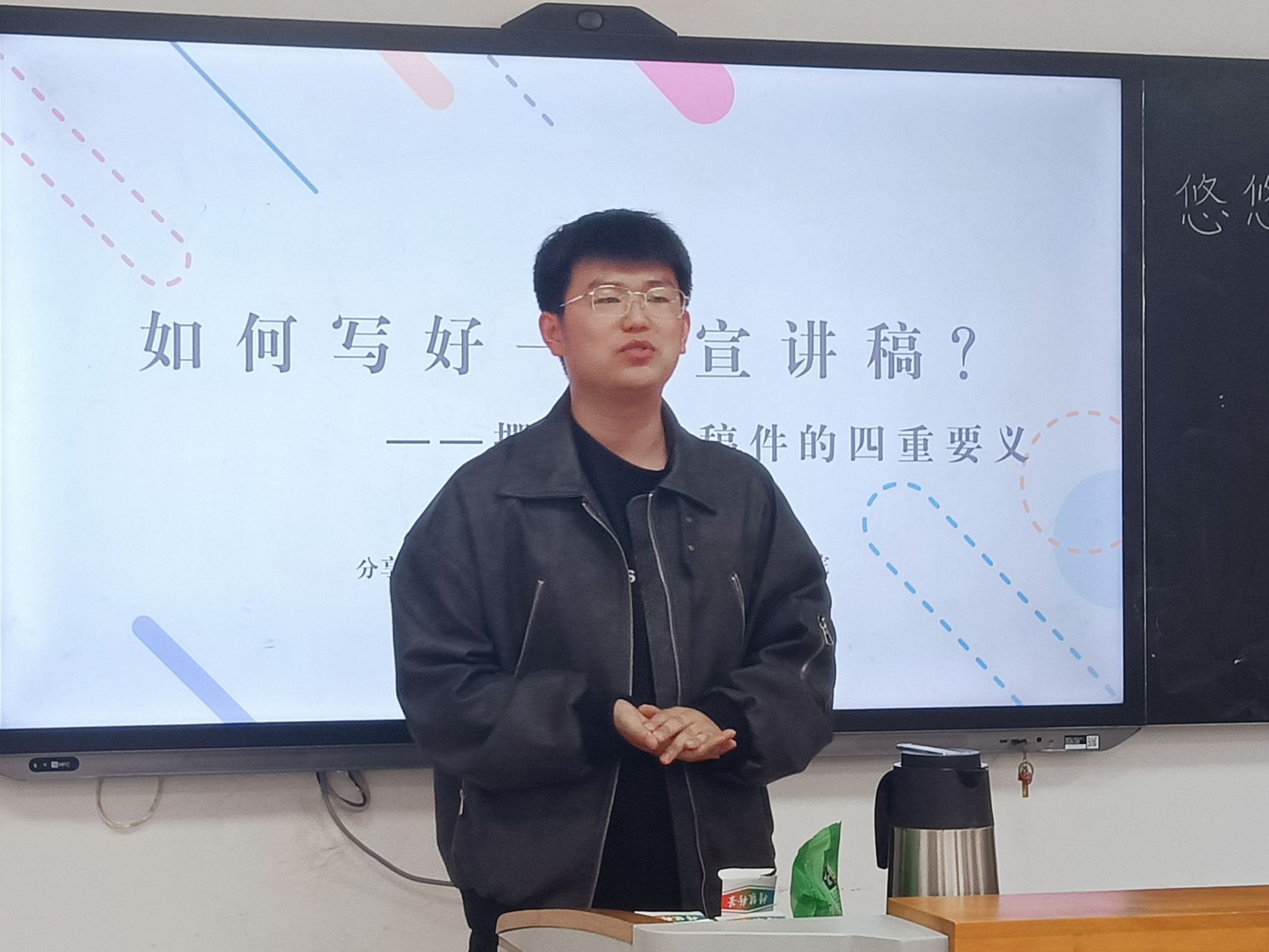 2024年5月10日,“悠悠文墨贯古今,文化时代共一色”主题宣讲比赛赛前培训在yl88858永利中国研究生教室二成功举行。杨志远和吴珂仪两位特邀嘉宾对撰稿技能与宣讲仪态进行了讲解和示范,为接下来的宣讲比赛助力。