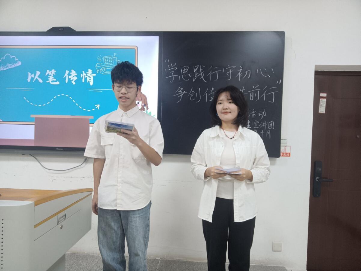 10月22日22:10,“学思践行守初心,争创佳绩共前行”团史培训活动在马院研二教室开展。活动伊始,由部长介绍各部门情况,部员合作绘画展示部门风采;在宣讲员带领下,团员们认真学习团史并积极参与抢答互动;活动接近尾声时,小宣人们一同聆听往届师兄师姐寄语,以奋斗为基,砥砺前行。