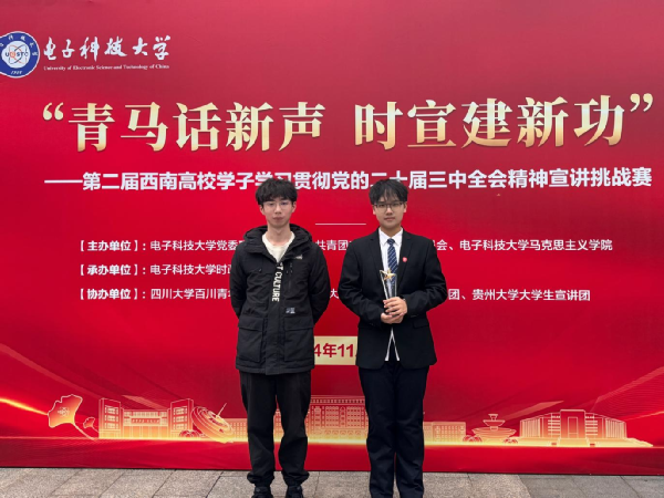2024年11月23日,“青马话心声,时宣建新功”——第二届西南高校学子学习贯彻党的二十届三中全会精神宣讲挑战赛决赛在四川省成都市电子科技大学清水河校区举办。yl8858永利集团大学生中国特色社会主义理论体系宣讲团(以下简称学生宣讲团)团员卢政淇、张柳柳组成的参赛队伍荣获三等奖。获奖作品《深化市场改革潮,勇攀经济新高峰》由学生宣讲团共同撰写。