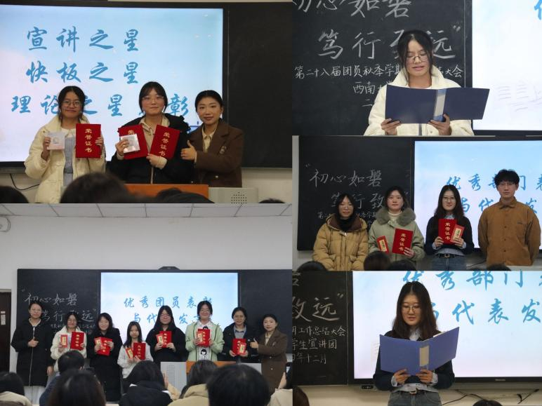 大会表彰本学期在宣讲、快板、理论方面表现突出的团员,评选出六名优秀团员与两个优秀部门。优秀团员代表曾蓥滢与优秀部门代表牛雅歆进行发言,表示将继续赓续前行、奋楫争先,为学生宣讲团发展而不懈努力。