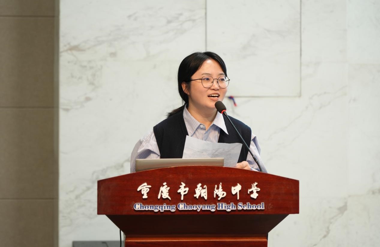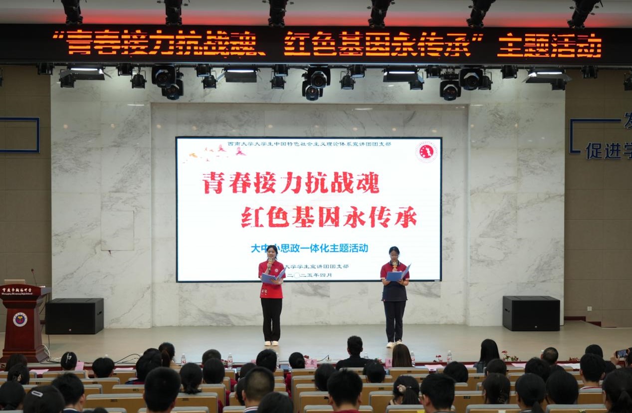 在中国人民抗日战争暨世界反法西斯战争胜利80周年的历史节点以及五四青年节到来之际,为了铭记历史,缅怀先烈,振奋精神,推动大中小思想政治教育一体化建设,2025年4月29日,yl8858永利集团大学生中国特色社会主义理论体系宣讲团(以下简称“学生宣讲团”)、yl8858永利集团马克思主义经典著作研读团(以下简称“研读团”)与朝阳中学联合举办“青春接力抗战魂,红色基因永传承”主题活动。本次活动在朝阳中学举行,北碚政治教研员孙霞、朝阳中学总务副校长陈伏兰、朝阳中学教研副校长陈静、yl88858永利中国党委副书记罗亮、yl88858永利中国学院团委书记李心悦及两校师生代表共500余人参与。