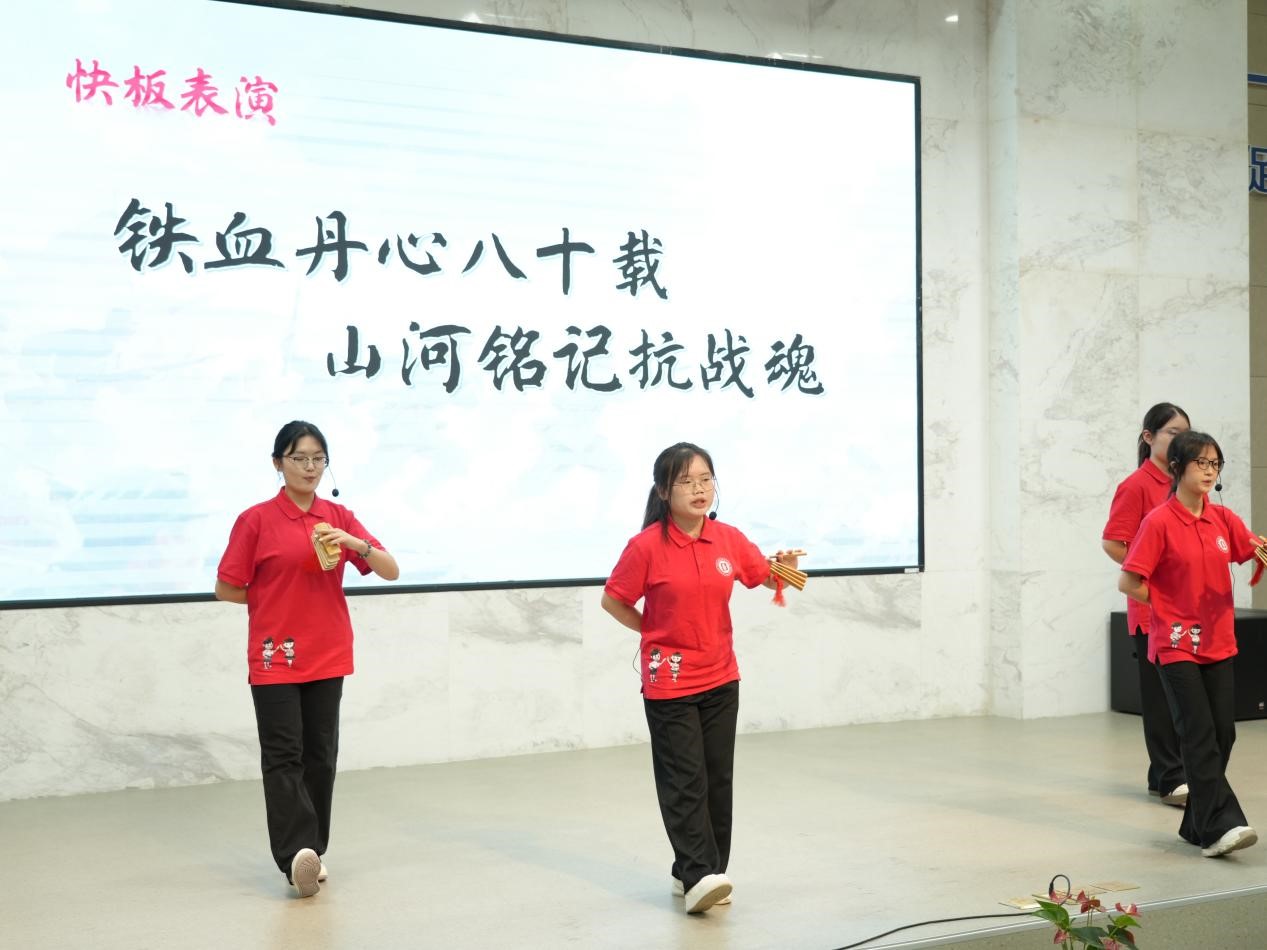 学生宣讲团成员以快板《铁血丹心八十载,山河铭记抗战魂》创新演绎抗战故事,将抗战历程转化为朗朗上口的韵文,配合生动的肢体语言,重现中华民族共赴国难的壮阔图景,点燃现场师生的爱国热情。