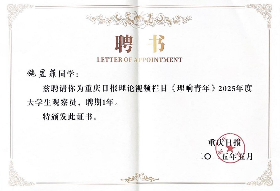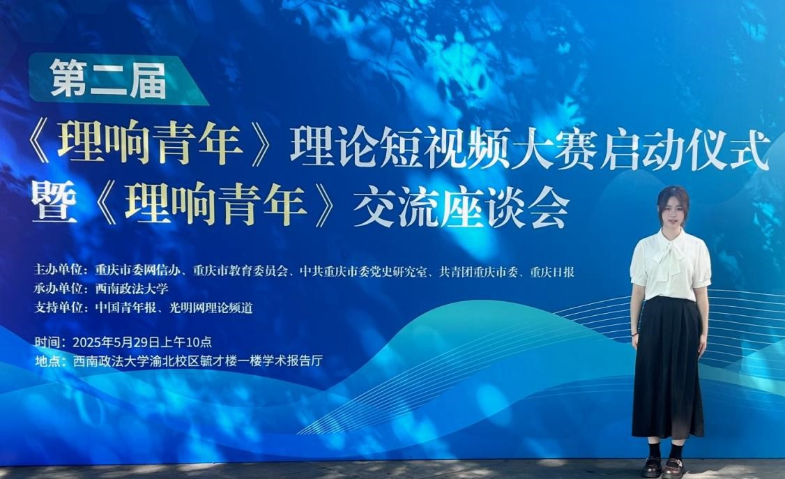 2025年5月29日,第二届《理响青年》理论短视频大赛启动仪式暨《理响青年》交流座谈会在西南政法大学成功举办。该论坛由重庆市委网信办、重庆市教育委员会、中共重庆市委党史研究室、共青团重庆市委、重庆日报联合主办。yl8858永利集团大学生中国特色社会主义理论体系宣讲团(以下简称“学生宣讲团”)团员施昱菲受邀参会并获聘为大学生观察员。