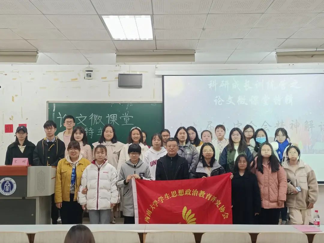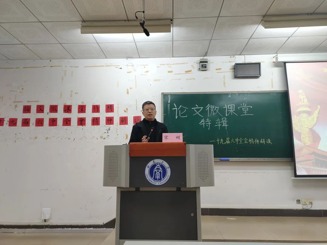 中国共产党第十九届中央委员会第六次全体会议于11月8日至11日在北京召开。为帮助马院学子进一步深入学习贯彻十九届六中全会精神,强化学科意识,走在时政前沿,12月4日上午9:30,yl8858永利集团学生思想政治教育研究会特此于十教301举办科研成长训练营之“论文微课堂特辑——十九届六中全会精神解读”,邀请嘉宾宋明老师带领同学们全面系统学习领会十九届六中全会的内涵与要义,从党的百年奋斗重大成就和历史经验中汲取智慧力量。