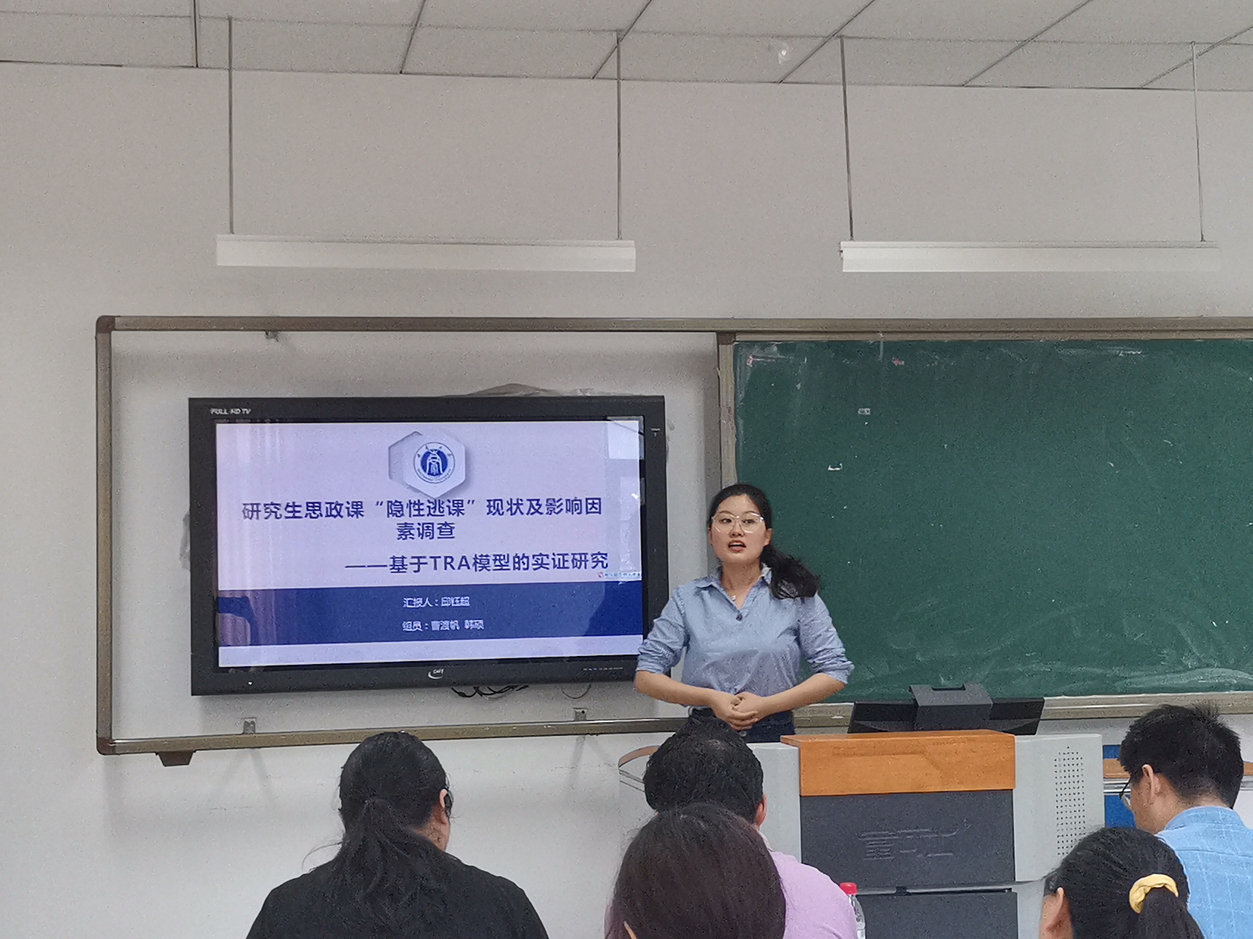 第三组共有17个小组参加汇报,靳玉军、许克松、雷 鉴、车 放、田丰老师担任本组评委,报告主题包括4篇专题报告和13篇调查报告,吴艳东教授指导、教育学部研究生曹渡帆、邱钰超、韩硕完成的《研究生思政课“隐性逃课”现状及影响因素调查——基于TRA模型的实证研究》荣获本小组一等奖。
