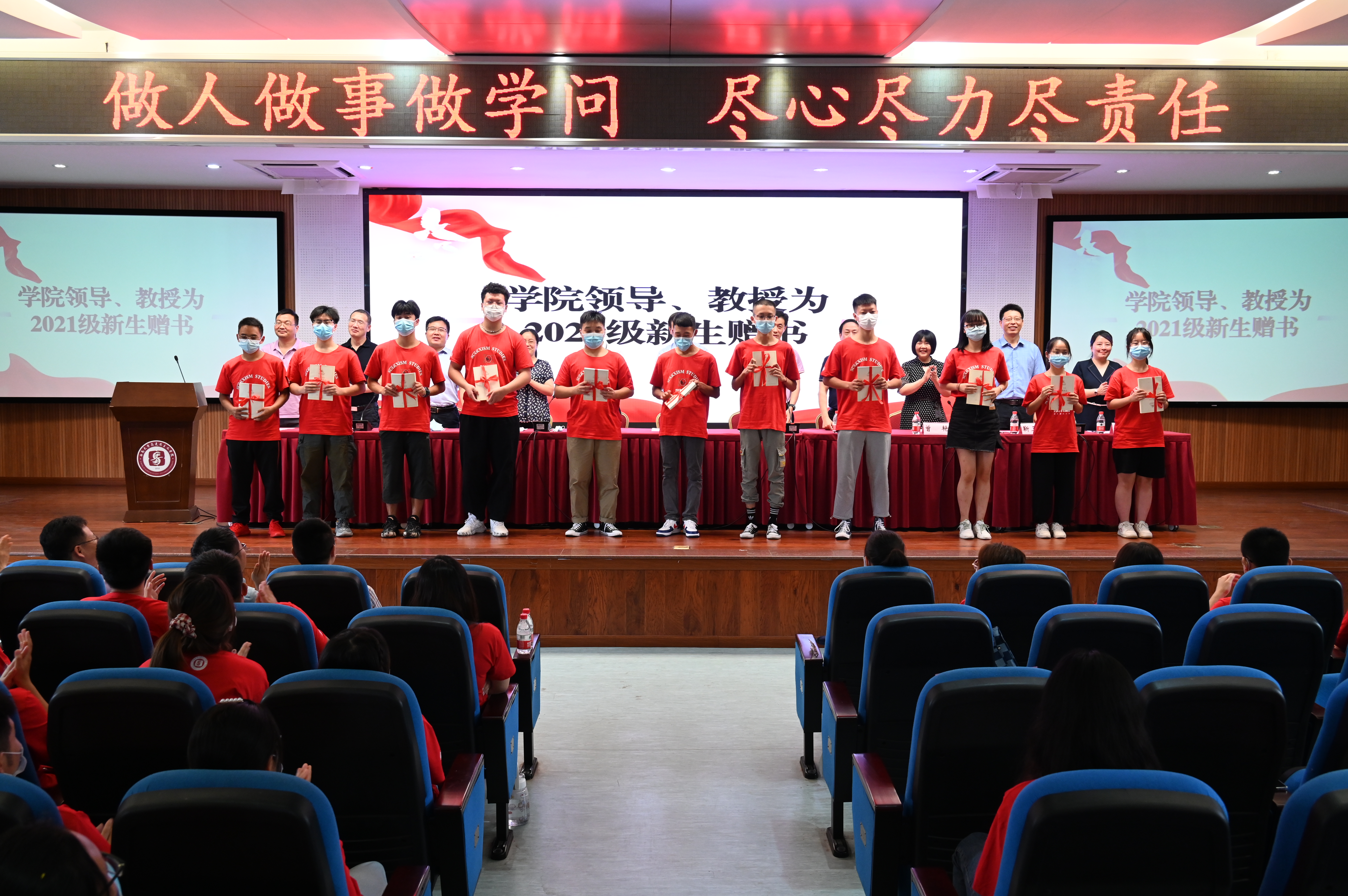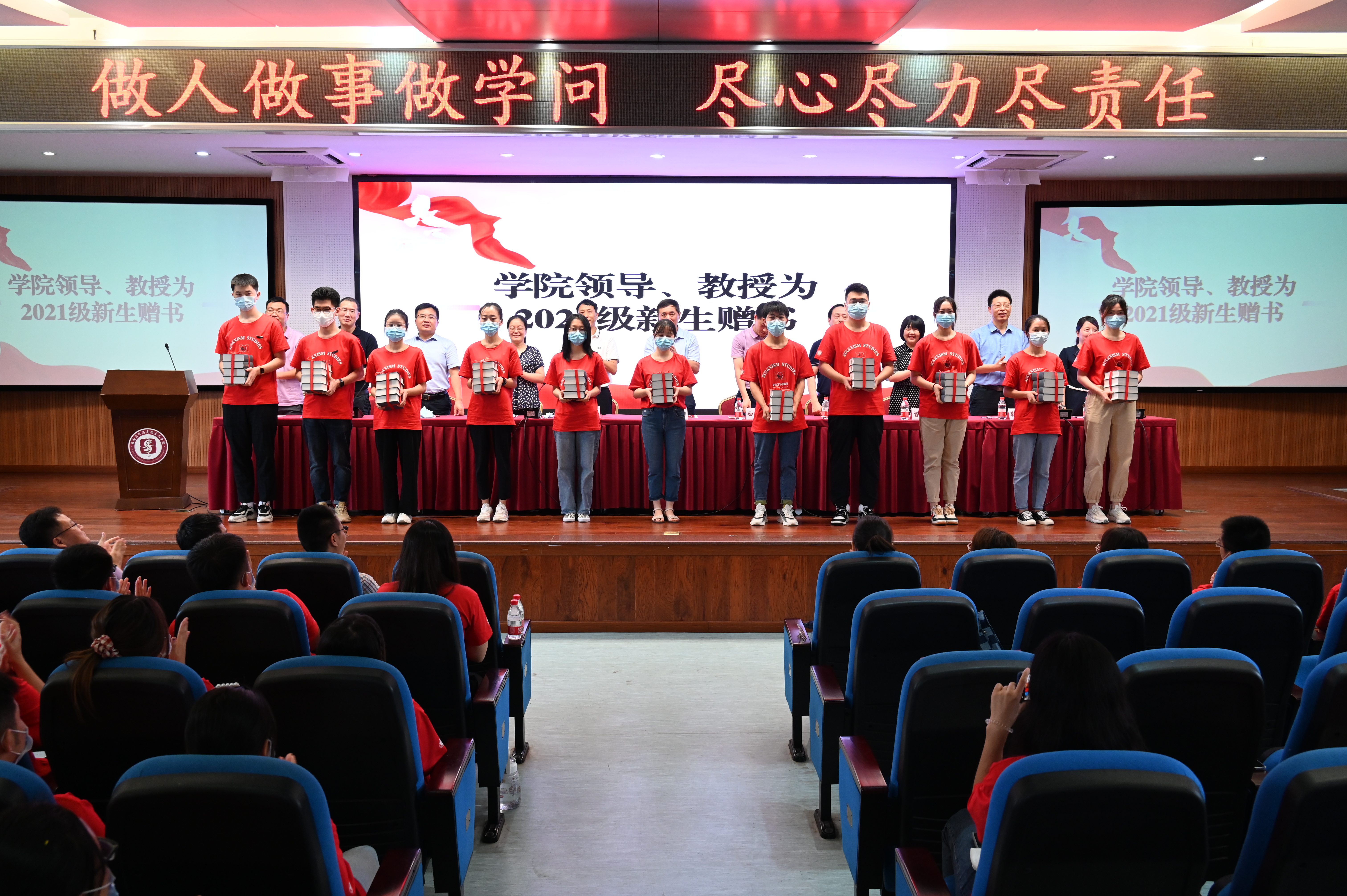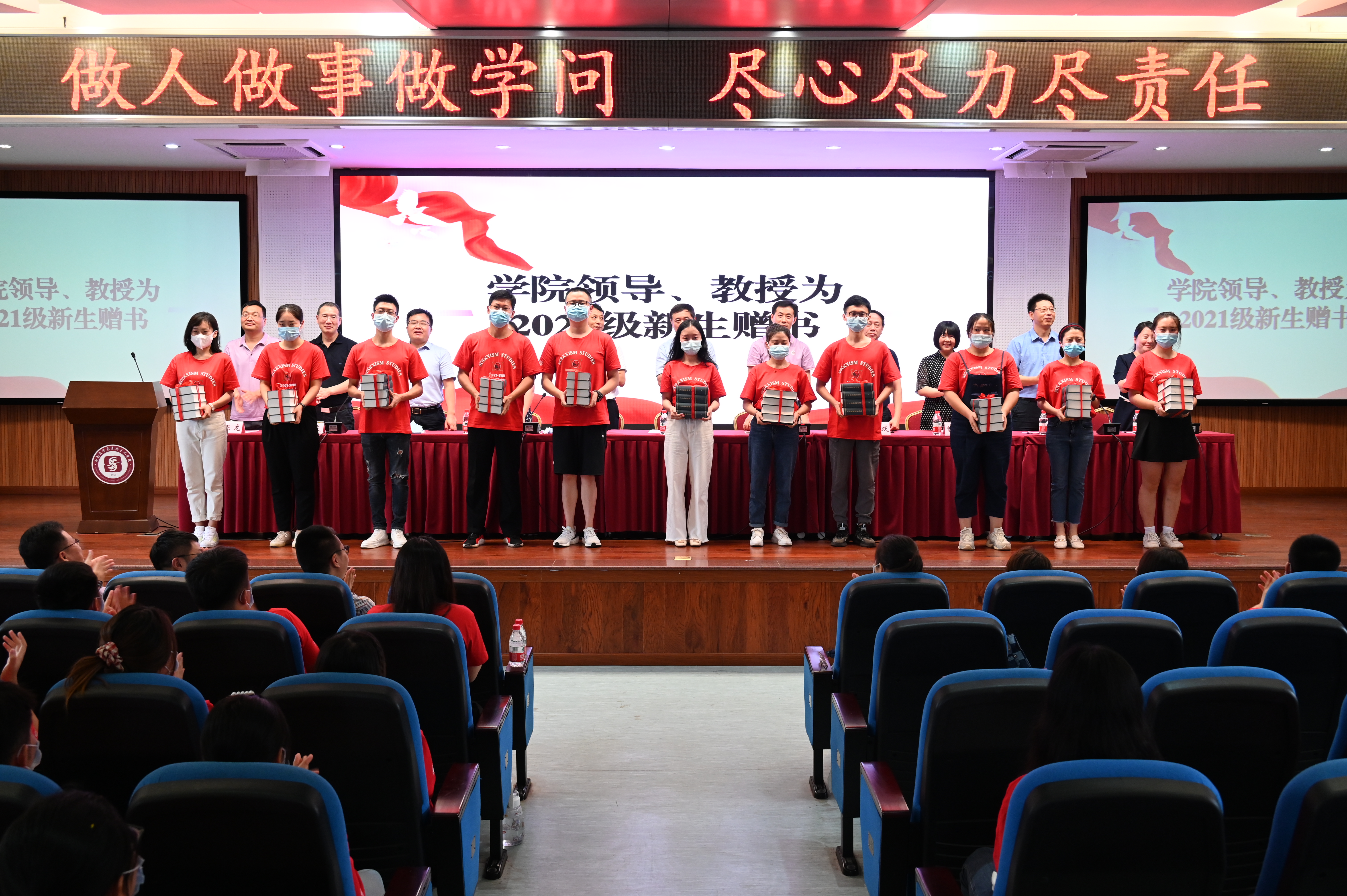 随后,学院领导、教授为2021级新生赠书。“读万卷书,行万里路”,一本本精致的书本承载着学院老师们对于新生的厚望,传递着浓浓的师生情谊。授书结束,白显良院长对新生进行寄语,表达了对新生的真切关怀与激励,希望他们在大学不负时代,不负韶华,为实现中华民族伟大复兴的中国梦而不懈奋斗。