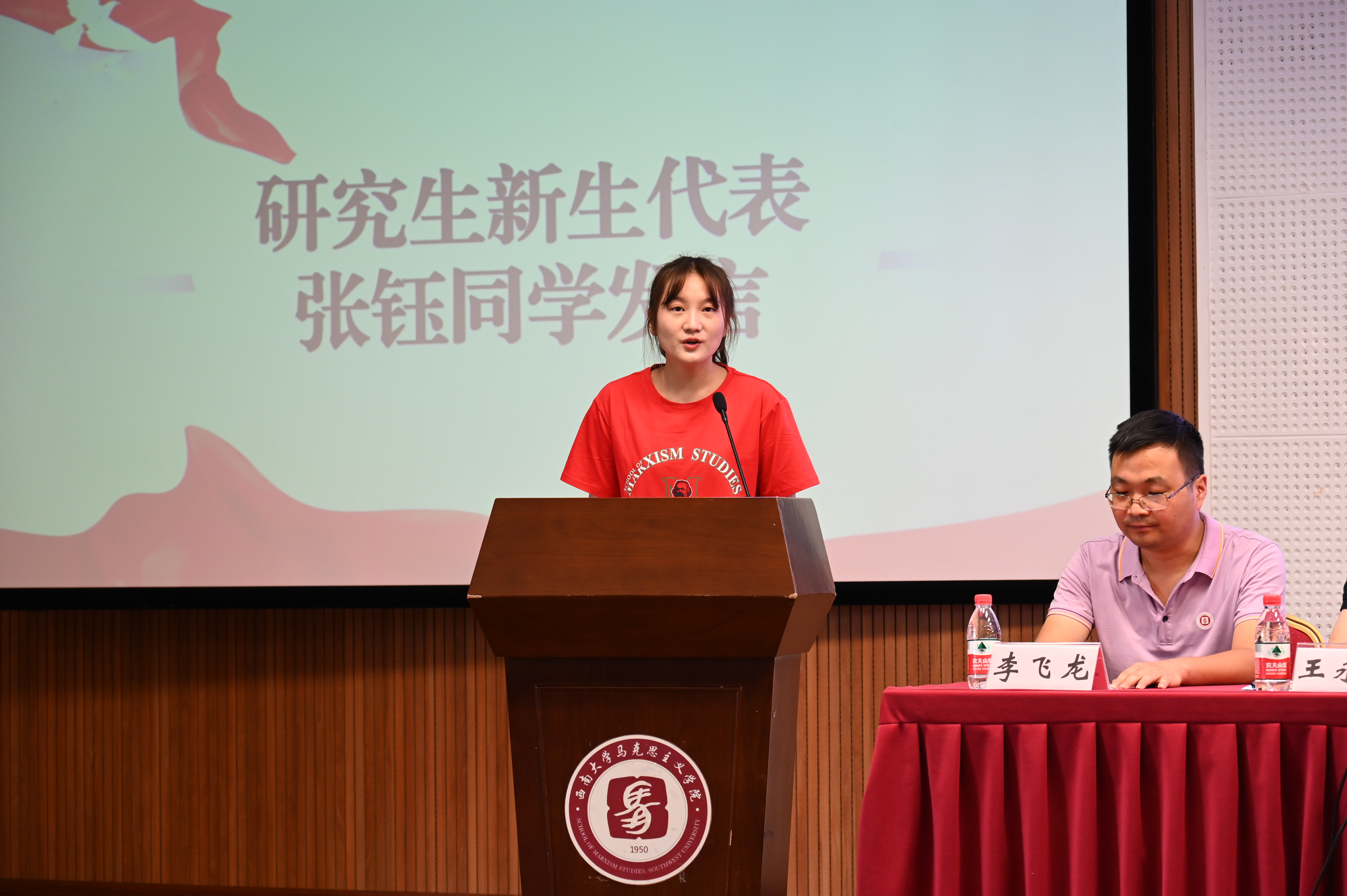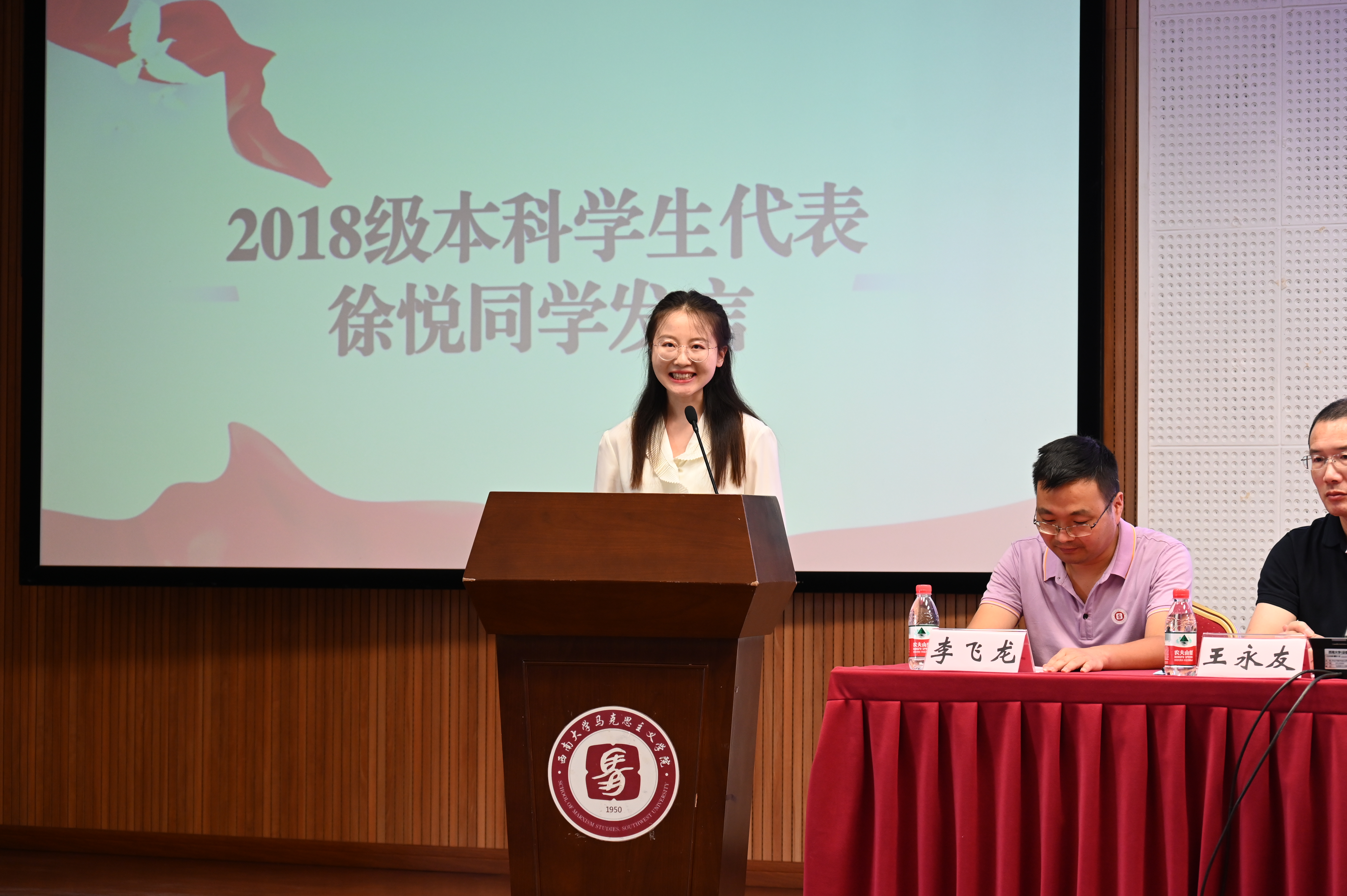 2018级本科学生代表徐悦同学表达了对学院的深切感恩,用自己的真切经历与同学们分享在四年学习中向下“扎根”,向上成长的感悟,激励大家不惧困难,从容自信,面对未来。研究生新生代表张钰同学从疫情中感悟“马院人”的责任与担当,表示自己将会积极学习“四史”,求真悟道,在实践中展现yl88858永利中国的风采。