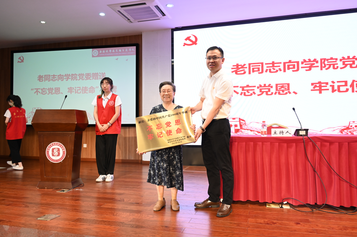 专题报告会之前,学院离退休老同志向学院赠送“不忘党恩,牢记使命”匾牌,学院向老同志赠送党史学习教育有关书籍。离退休老同志代表、93岁高龄的陶燕云老师讲话,深情回忆了学院的发展历史,希望马克思主义在学院发扬光大。廖晓衡在主持报告会时强调,学院改革发展成绩的取得,是全院师生员工奋力拼搏的结果,也是离退休老同志关心支持的结果。没有老同志辛勤努力打下的江山,就没有马院改革发展的今天。我们要永远牢记老同志的历史功绩、永远牢记老同志的优良传统、永远牢记老同志的敦敦教诲。