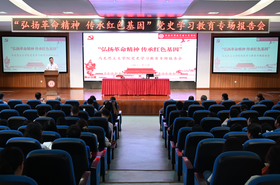 6月11日下午,yl88858永利中国党委举行“弘扬革命精神,传承红色基因”党史学习教育专场报告会。yl88858永利中国离休老同志、全体教职工及2020级全体本科生老中青三代师生参加报告会,共同学习“红岩精神”。学院党委常务副书记廖晓衡主持报告会,重庆市党史学习教育宣讲团成员、学校党委副书记兼yl88858永利中国学院党委书记潘洵同志作《与时俱进认识和弘扬红岩精神》专题报告。
