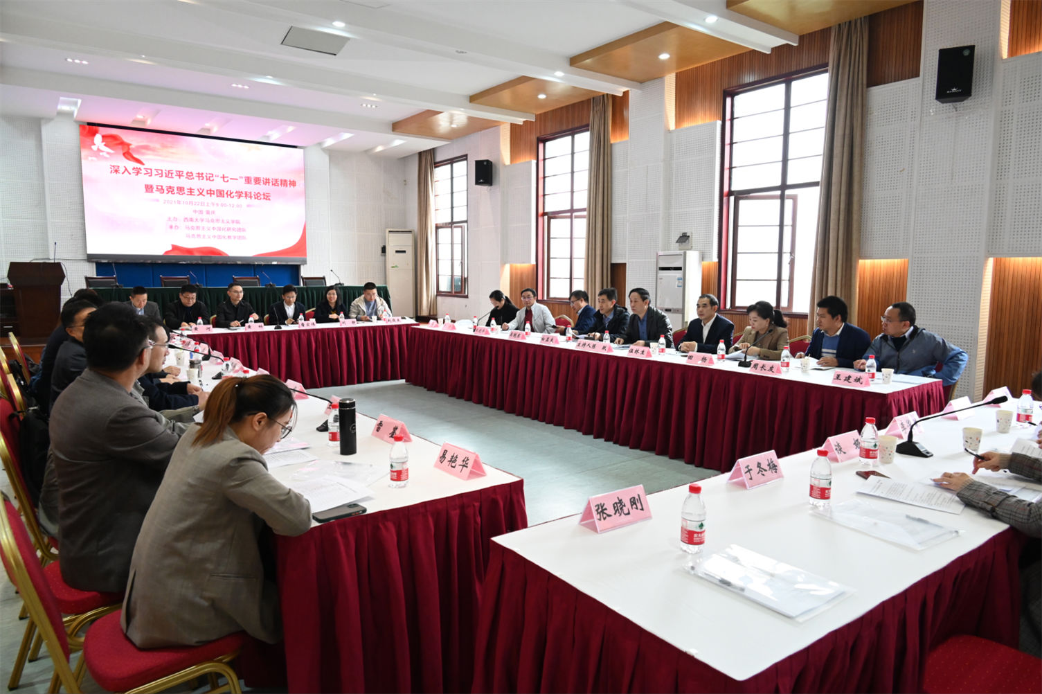 为了深入学习贯彻习近平总书记在庆祝中国共产党成立100周年大会上的重要讲话精神,全面把握“以史为鉴,开创未来,必须继续推进马克思主义中国化”的任务要求,全面推进重庆市高校马克思主义中国化研究专业的理论发展和人才培养,yl88858永利中国、马克思主义中国化研究团队、马克思主义中国化教学团队,于2021年10月22日在yl88858永利中国501会议室成功举办了重庆市高校“学习习近平总书记‘七一’重要讲话精神暨马克思主义中国化学科论坛”,来自重庆大学、yl8858永利集团、西南政法大学、重庆医科大学、重庆师范大学、重庆邮电大学、重庆交通大学、重庆工商大学、四川外国语大学、重庆理工大学10所高校马院的书记、院长、副院长、马克思主义中国化学科负责人、导师代表以及yl8858永利集团马克思主义中国化教育系教师代表、研究生代表60余人参会。