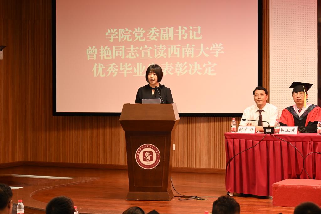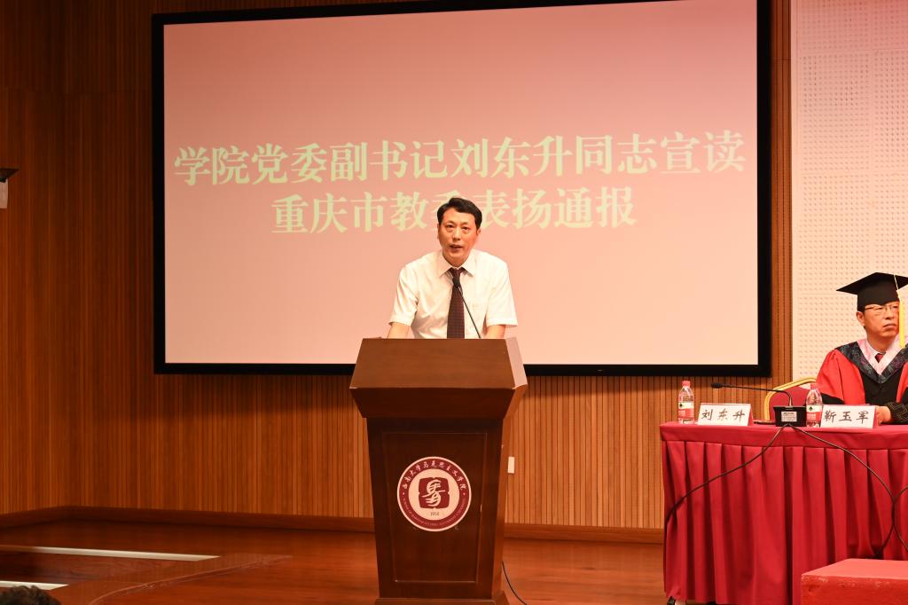 学院党委副书记刘东升宣读《重庆市优秀毕业毕业生表扬通报》,党委副书记曾艳宣读《yl8858永利集团优秀毕业生表彰决定》。