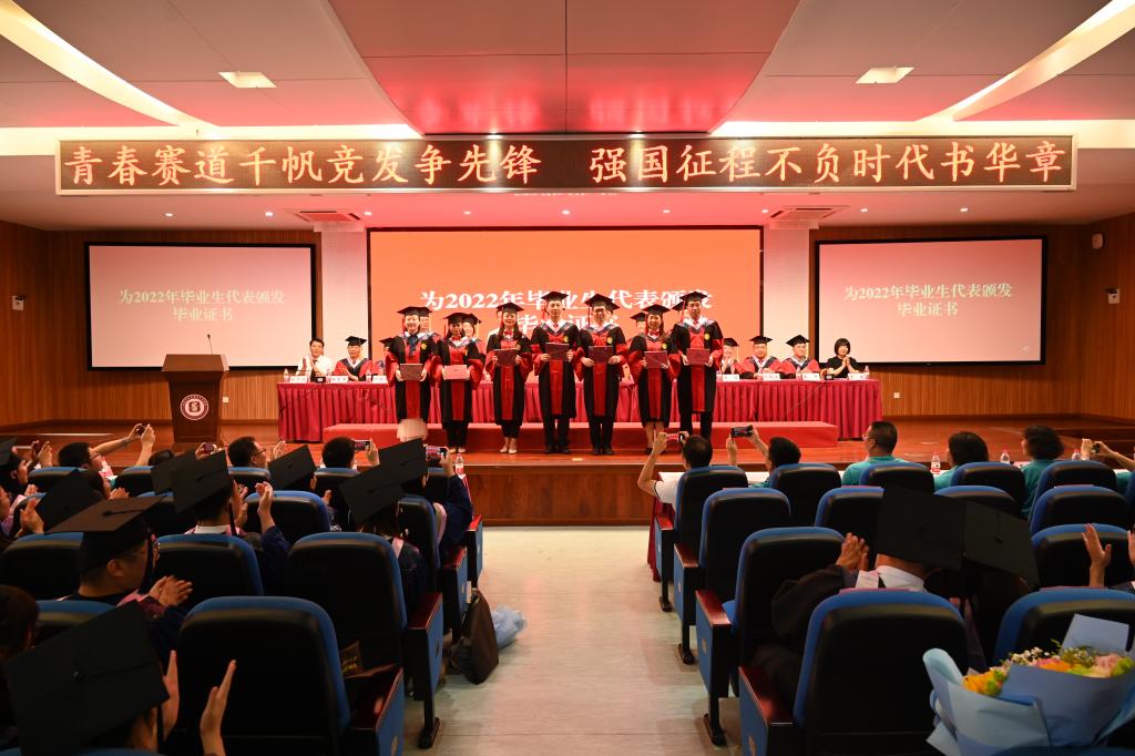 在激昂的音乐中,学院学术委员会老师为2022届毕业生授位。